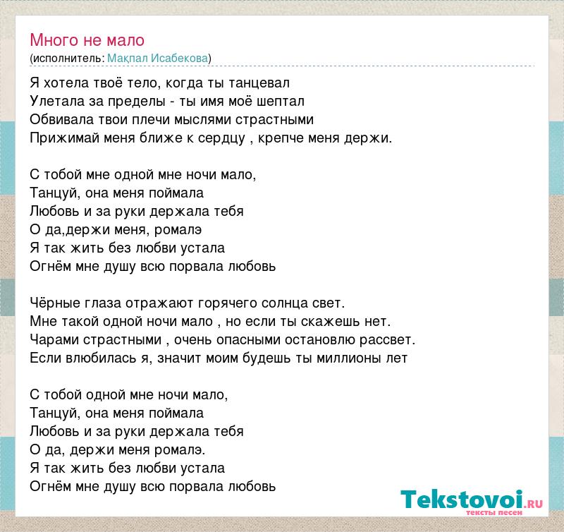 Я хотела твоё тело, когда ты танцевал Улетала за пределы - ты имя моё шептал Обвивала твои плечи мыслями страстными Прижимай меня ближе к сердцу , крепче меня держи. С тобой мне одной мне ночи мало, Танцуй, она меня поймала Любовь и за руки держала тебя О да,держи меня, ромалэ Я так жить без любви устала Огнём мне душу всю порвала любовь Чёрные глаза отражают горячего солнца свет. Мне такой одной ночи мало , но если ты скажешь нет. Чарами страстными , очень опасными остановлю рассвет. Если влюбилась я, значит моим будешь ты миллионы лет С тобой одной мне ночи мало, Танцуй, она меня поймала Любовь и за руки держала тебя О да, держи меня ромалэ. Я так жить без любви устала Огнём мне душу всю порвала любовь