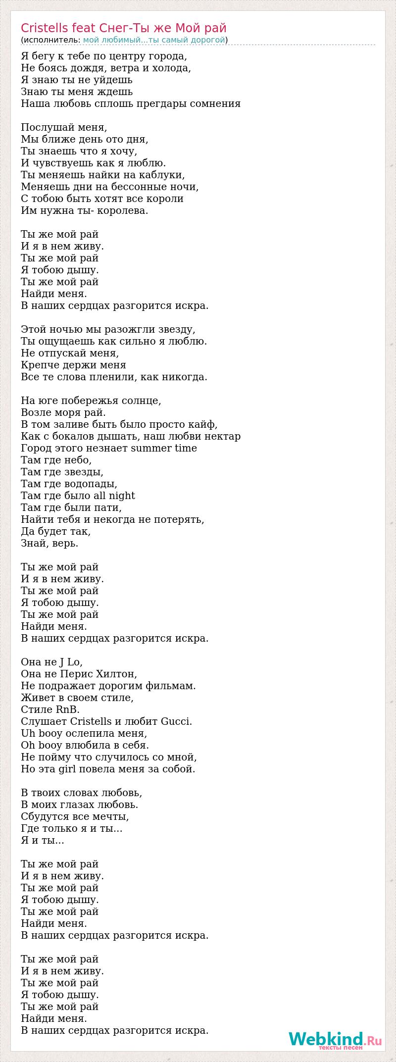 Я бегу к тебе по центру города, Не боясь дождя, ветра и холода, Я знаю ты не уйдешь Знаю ты меня ждешь Наша любовь сплошь прегдары сомнения Послушай меня, Мы ближе день ото дня, Ты знаешь что я хочу, И чувствуешь как я люблю. Ты меняешь найки на каблуки, Меняешь дни на бессонные ночи, С тобою быть хотят все короли Им нужна ты- королева. Ты же мой рай И я в нем живу. Ты же мой рай Я тобою дышу. Ты же мой рай Найди меня. В наших сердцах разгорится искра. Этой ночью мы разожгли звезду, Ты ощущаешь как сильно я люблю. Не отпускай меня, Крепче держи меня Все те слова пленили, как никогда. На юге побережья cолнце, Возле моря рай. В том заливе быть было просто кайф, Как с бокалов дышать, наш любви нектар Город этого незнает summer time Там где небо, Там где звезды, Там где водопады, Там где было all night Там где были пати, Найти тебя и некогда не потерять, Да будет так, Знай, верь. Ты же мой рай И я в нем живу. Ты же мой рай Я тобою дышу. Ты же мой рай Найди меня. В наших сердцах разгорится искра. Она не J Lo, Она не Перис Хилтон, Не подражает дорогим фильмам. Живет в своем стиле, Стиле RnB. Cлушает Cristells и любит Gucci. Uh booy ослепила меня, Оh booy влюбила в себя. Не пойму что случилось со мной, Но эта girl повела меня за собой. В твоих словах любовь, В моих глазах любовь. Сбудутся все мечты, Где только я и ты... Я и ты... Ты же мой рай И я в нем живу. Ты же мой рай Я тобою дышу. Ты же мой рай Найди меня. В наших сердцах разгорится искра. Ты же мой рай И я в нем живу. Ты же мой рай Я тобою дышу. Ты же мой рай Найди меня. В наших сердцах разгорится искра.