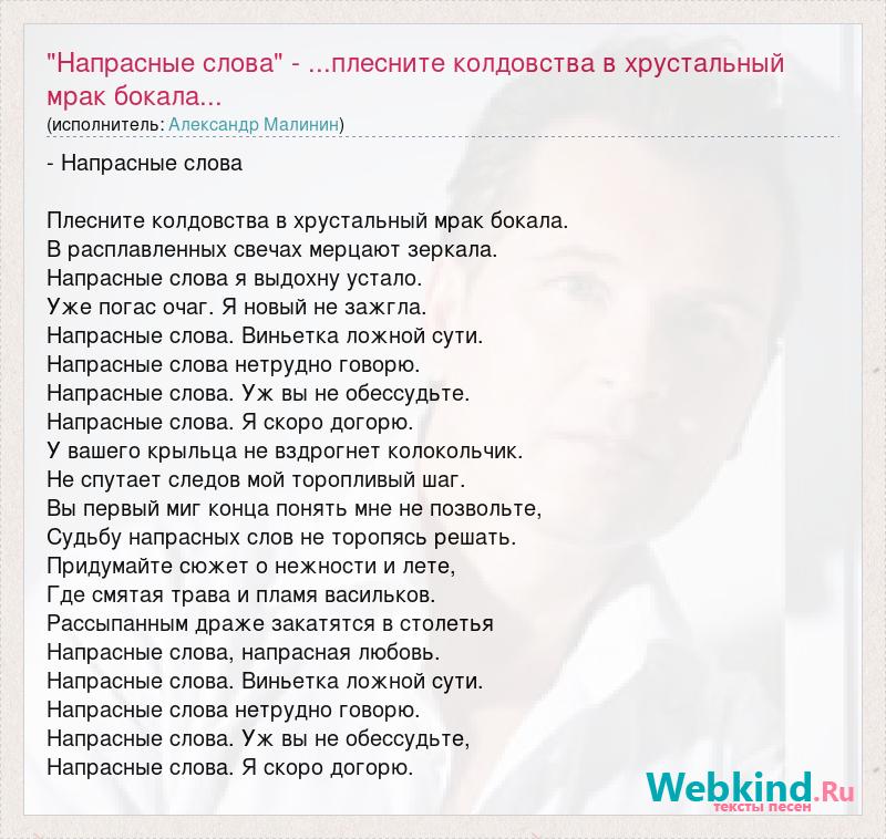 - Напрасные слова Плесните колдовства в хрустальный мрак бокала. В расплавленных свечах мерцают зеркала. Напрасные слова я выдохну устало. Уже погас очаг. Я новый не зажгла. Напрасные слова. Виньетка ложной сути. Напрасные слова нетрудно говорю. Напрасные слова. Уж вы не обессудьте. Напрасные слова. Я скоро догорю. У вашего крыльца не вздрогнет колокольчик. Не спутает следов мой торопливый шаг. Вы первый миг конца понять мне не позвольте, Судьбу напрасных слов не торопясь решать. Придумайте сюжет о нежности и лете, Где смятая трава и пламя васильков. Рассыпанным драже закатятся в столетья Напрасные слова, напрасная любовь. Напрасные слова. Виньетка ложной сути. Напрасные слова нетрудно говорю. Напрасные слова. Уж вы не обессудьте, Напрасные слова. Я скоро догорю.