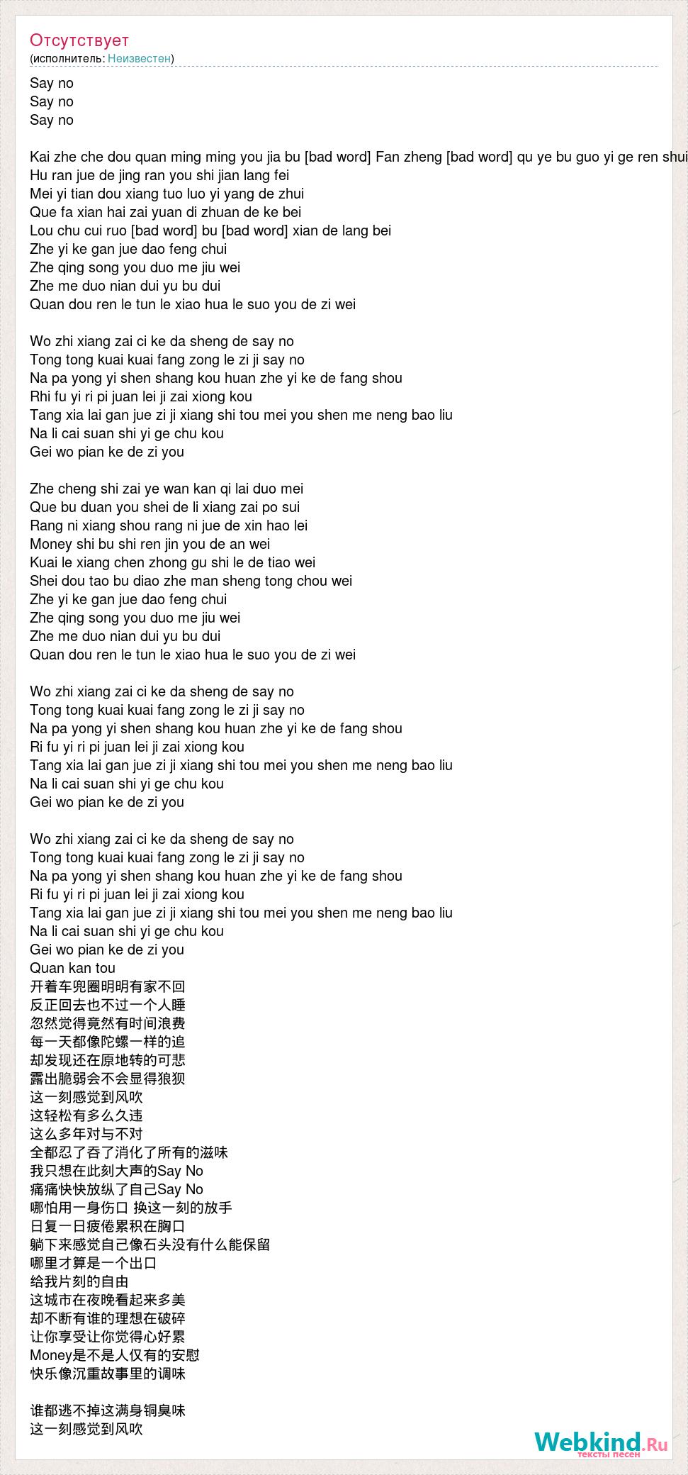 Say no Say no Say no Kai zhe che dou quan ming ming you jia bu [bad word] Fan zheng [bad word] qu ye bu guo yi ge ren shui Hu ran jue de jing ran you shi jian lang fei Mei yi tian dou xiang tuo luo yi yang de zhui Que fa xian hai zai yuan di zhuan de ke bei Lou chu cui ruo [bad word] bu [bad word] xian de lang bei Zhe yi ke gan jue dao feng chui Zhe qing song you duo me jiu wei Zhe me duo nian dui yu bu dui Quan dou ren le tun le xiao hua le suo you de zi wei Wo zhi xiang zai ci ke da sheng de say no Tong tong kuai kuai fang zong le zi ji say no Na pa yong yi shen shang kou huan zhe yi ke de fang shou Rhi fu yi ri pi juan lei ji zai xiong kou Tang xia lai gan jue zi ji xiang shi tou mei you shen me neng bao liu Na li cai suan shi yi ge chu kou Gei wo pian ke de zi you Zhe cheng shi zai ye wan kan qi lai duo mei Que bu duan you shei de li xiang zai po sui Rang ni xiang shou rang ni jue de xin hao lei Money shi bu shi ren jin you de an wei Kuai le xiang chen zhong gu shi le de tiao wei Shei dou tao bu diao zhe man sheng tong chou wei Zhe yi ke gan jue dao feng chui Zhe qing song you duo me jiu wei Zhe me duo nian dui yu bu dui Quan dou ren le tun le xiao hua le suo you de zi wei Wo zhi xiang zai ci ke da sheng de say no Tong tong kuai kuai fang zong le zi ji say no Na pa yong yi shen shang kou huan zhe yi ke de fang shou Ri fu yi ri pi juan lei ji zai xiong kou Tang xia lai gan jue zi ji xiang shi tou mei you shen me neng bao liu Na li cai suan shi yi ge chu kou Gei wo pian ke de zi you Wo zhi xiang zai ci ke da sheng de say no Tong tong kuai kuai fang zong le zi ji say no Na pa yong yi shen shang kou huan zhe yi ke de fang shou Ri fu yi ri pi juan lei ji zai xiong kou Tang xia lai gan jue zi ji xiang shi tou mei you shen me neng bao liu Na li cai suan shi yi ge chu kou Gei wo pian ke de zi you Quan kan tou 开着车兜圈明明有家不回 反正回去也不过一个人睡 忽然觉得竟然有时间浪费 每一天都像陀螺一样的追 却发现还在原地转的可悲 露出脆弱会不会显得狼狈 这一刻感觉到风吹 这轻松有多么久违 这么多年对与不对 全都忍了吞了消化了所有的滋味 我只想在此刻大声的Say No 痛痛快快放纵了自己Say No 哪怕用一身伤口 换这一刻的放手 日复一日疲倦累积在胸口 躺下来感觉自己像石头没有什么能保留 哪里才算是一个出口 给我片刻的自由 这城市在夜晚看起来多美 却不断有谁的理想在破碎 让你享受让你觉得心好累 Money是不是人仅有的安慰 快乐像沉重故事里的调味 谁都逃不掉这满身铜臭味 这一刻感觉到风吹