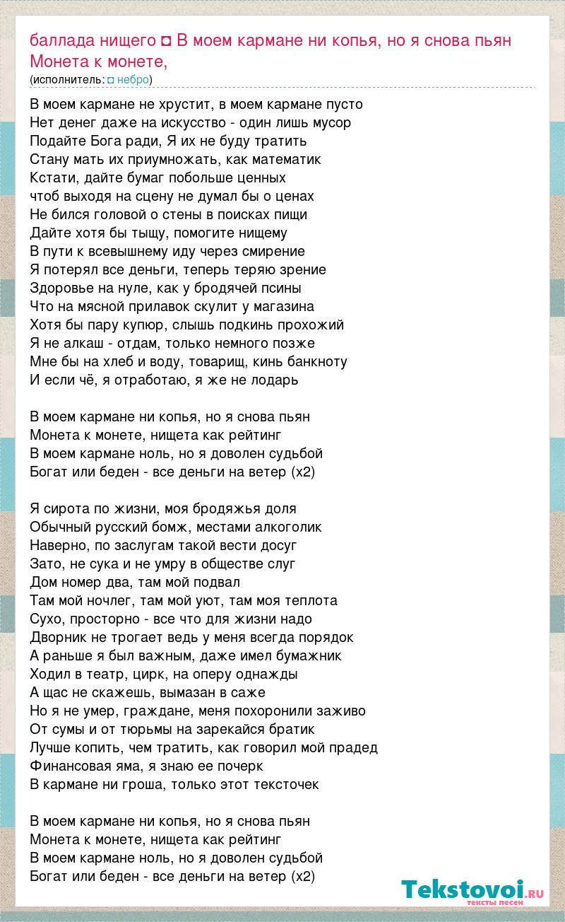 В моем кармане не хрустит, в моем кармане пусто Нет денег даже на искусство - один лишь мусор Подайте Бога ради, Я их не буду тратить Стану мать их приумножать, как математик Кстати, дайте бумаг побольше ценных чтоб выходя на сцену не думал бы о ценах Не бился головой о стены в поисках пищи Дайте хотя бы тыщу, помогите нищему В пути к всевышнему иду через смирение Я потерял все деньги, теперь теряю зрение Здоровье на нуле, как у бродячей псины Что на мясной прилавок скулит у магазина Хотя бы пару купюр, слышь подкинь прохожий Я не алкаш - отдам, только немного позже Мне бы на хлеб и воду, товарищ, кинь банкноту И если чё, я отработаю, я же не лодарь В моем кармане ни копья, но я снова пьян Монета к монете, нищета как рейтинг В моем кармане ноль, но я доволен судьбой Богат или беден - все деньги на ветер (х2) Я сирота по жизни, моя бродяжья доля Обычный русский бомж, местами алкоголик Наверно, по заслугам такой вести досуг Зато, не сука и не умру в обществе слуг Дом номер два, там мой подвал Там мой ночлег, там мой уют, там моя теплота Сухо, просторно - все что для жизни надо Дворник не трогает ведь у меня всегда порядок А раньше я был важным, даже имел бумажник Ходил в театр, цирк, на оперу однажды А щас не скажешь, вымазан в саже Но я не умер, граждане, меня похоронили заживо От сумы и от тюрьмы на зарекайся братик Лучше копить, чем тратить, как говорил мой прадед Финансовая яма, я знаю ее почерк В кармане ни гроша, только этот тексточек В моем кармане ни копья, но я снова пьян Монета к монете, нищета как рейтинг В моем кармане ноль, но я доволен судьбой Богат или беден - все деньги на ветер (х2)