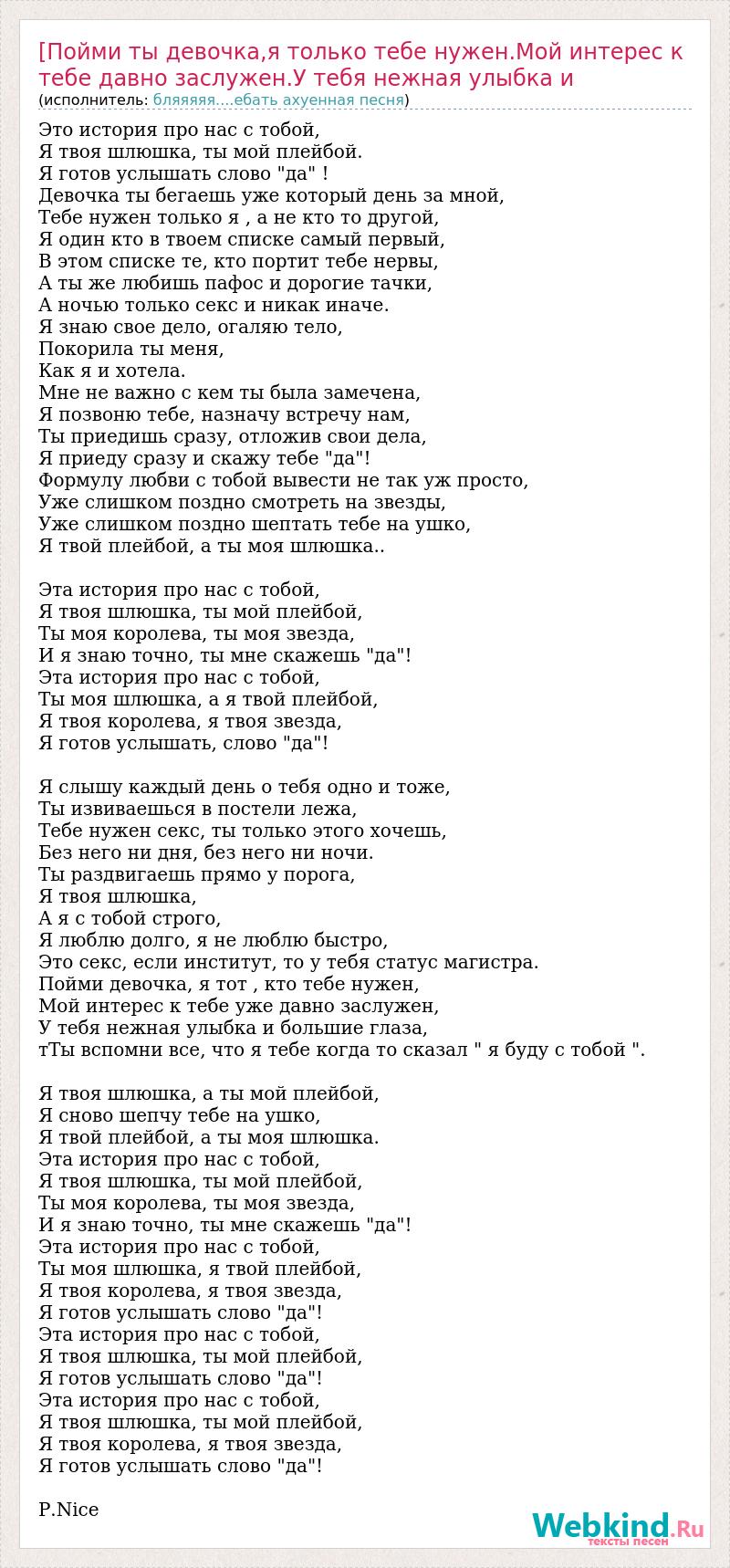 Это история про нас с тобой, Я твоя шлюшка, ты мой плейбой. Я готов услышать слово "да" ! Девочка ты бегаешь уже который день за мной, Тебе нужен только я , а не кто то другой, Я один кто в твоем списке самый первый, В этом списке те, кто портит тебе нервы, А ты же любишь пафос и дорогие тачки, А ночью только секс и никак иначе. Я знаю свое дело, огаляю тело, Покорила ты меня, Как я и хотела. Мне не важно с кем ты была замечена, Я позвоню тебе, назначу встречу нам, Ты приедишь сразу, отложив свои дела, Я приеду сразу и скажу тебе "да"! Формулу любви с тобой вывести не так уж просто, Уже слишком поздно смотреть на звезды, Уже слишком поздно шептать тебе на ушко, Я твой плейбой, а ты моя шлюшка.. Эта история про нас с тобой, Я твоя шлюшка, ты мой плейбой, Ты моя королева, ты моя звезда, И я знаю точно, ты мне скажешь "да"! Эта история про нас с тобой, Ты моя шлюшка, а я твой плейбой, Я твоя королева, я твоя звезда, Я готов услышать, слово "да"! Я слышу каждый день о тебя одно и тоже, Ты извиваешься в постели лежа, Тебе нужен секс, ты только этого хочешь, Без него ни дня, без него ни ночи. Ты раздвигаешь прямо у порога, Я твоя шлюшка, А я с тобой строго, Я люблю долго, я не люблю быстро, Это секс, если институт, то у тебя статус магистра. Пойми девочка, я тот , кто тебе нужен, Мой интерес к тебе уже давно заслужен, У тебя нежная улыбка и большие глаза, тТы вспомни все, что я тебе когда то сказал " я буду с тобой ". Я твоя шлюшка, а ты мой плейбой, Я сново шепчу тебе на ушко, Я твой плейбой, а ты моя шлюшка. Эта история про нас с тобой, Я твоя шлюшка, ты мой плейбой, Ты моя королева, ты моя звезда, И я знаю точно, ты мне скажешь "да"! Эта история про нас с тобой, Ты моя шлюшка, я твой плейбой, Я твоя королева, я твоя звезда, Я готов услышать слово "да"! Эта история про нас с тобой, Я твоя шлюшка, ты мой плейбой, Я готов услышать слово "да"! Эта история про нас с тобой, Я твоя шлюшка, ты мой плейбой, Я твоя королева, я твоя звезда, Я готов услышать слово "да"! P.Nice