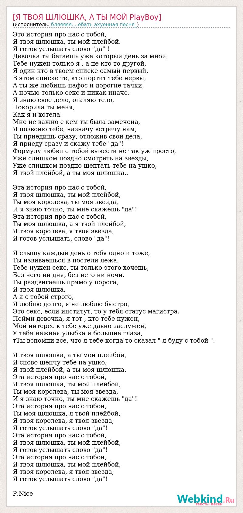 Это история про нас с тобой, Я твоя шлюшка, ты мой плейбой. Я готов услышать слово "да" ! Девочка ты бегаешь уже который день за мной, Тебе нужен только я , а не кто то другой, Я один кто в твоем списке самый первый, В этом списке те, кто портит тебе нервы, А ты же любишь пафос и дорогие тачки, А ночью только секс и никак иначе. Я знаю свое дело, огаляю тело, Покорила ты меня, Как я и хотела. Мне не важно с кем ты была замечена, Я позвоню тебе, назначу встречу нам, Ты приедишь сразу, отложив свои дела, Я приеду сразу и скажу тебе "да"! Формулу любви с тобой вывести не так уж просто, Уже слишком поздно смотреть на звезды, Уже слишком поздно шептать тебе на ушко, Я твой плейбой, а ты моя шлюшка.. Эта история про нас с тобой, Я твоя шлюшка, ты мой плейбой, Ты моя королева, ты моя звезда, И я знаю точно, ты мне скажешь "да"! Эта история про нас с тобой, Ты моя шлюшка, а я твой плейбой, Я твоя королева, я твоя звезда, Я готов услышать, слово "да"! Я слышу каждый день о тебя одно и тоже, Ты извиваешься в постели лежа, Тебе нужен секс, ты только этого хочешь, Без него ни дня, без него ни ночи. Ты раздвигаешь прямо у порога, Я твоя шлюшка, А я с тобой строго, Я люблю долго, я не люблю быстро, Это секс, если институт, то у тебя статус магистра. Пойми девочка, я тот , кто тебе нужен, Мой интерес к тебе уже давно заслужен, У тебя нежная улыбка и большие глаза, тТы вспомни все, что я тебе когда то сказал " я буду с тобой ". Я твоя шлюшка, а ты мой плейбой, Я сново шепчу тебе на ушко, Я твой плейбой, а ты моя шлюшка. Эта история про нас с тобой, Я твоя шлюшка, ты мой плейбой, Ты моя королева, ты моя звезда, И я знаю точно, ты мне скажешь "да"! Эта история про нас с тобой, Ты моя шлюшка, я твой плейбой, Я твоя королева, я твоя звезда, Я готов услышать слово "да"! Эта история про нас с тобой, Я твоя шлюшка, ты мой плейбой, Я готов услышать слово "да"! Эта история про нас с тобой, Я твоя шлюшка, ты мой плейбой, Я твоя королева, я твоя звезда, Я готов услышать слово "да"! P.Nice