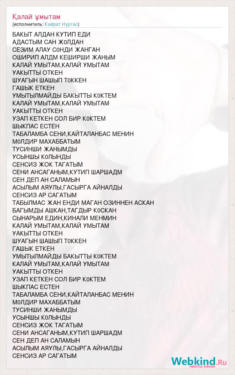 БАКЫТ АЛДАН КУТИП ЕДИ АДАСТЫМ САН Ж0ЛДАН СЕЗИМ АЛАУ С0НДИ ЖАНГАН ОШИРИП АЛДМ КЕШИРШИ ЖАНЫМ КАЛАЙ УМЫТАМ,КАЛАЙ УМЫТАМ УАКЫТТЫ ОТКЕН ШУАГЫН ШАШЫП Т0ККЕН ГАШЫК ЕТКЕН УМЫТЫЛМАЙДЫ БАКЫТТЫ К0КТЕМ КАЛАЙ УМЫТАМ,КАЛАЙ УМЫТАМ УАКЫТТЫ ОТКЕН УЗАП КЕТКЕН СОЛ БИР К0КТЕМ ШЫКПАС ЕСТЕН ТАБАЛАМБА СЕНИ,КАЙТАЛАНБАС МЕНИН М0ЛДИР МАХАББАТЫМ ТУСИНШИ ЖАНЫМДЫ УСЫНШЫ К0ЛЫНДЫ СЕНСИЗ ЖОК ТАГАТЫМ СЕНИ АНСАГАНЫМ,КУТИП ШАРШАДМ СЕН ДЕП АН САЛАМЫН АСЫЛЫМ АЯУЛЫ,ГАСЫРГА АЙНАЛДЫ СЕНСИЗ АР САГАТЫМ ТАБЫЛМАС ЖАН ЕНДИ МАГАН ОЗИННЕН АСКАН БАГЫМДЫ АШКАН,ТАГДЫР К0СКАН СЫНАРЫМ ЕДИН,КИНАЛИ МЕНМИН КАЛАЙ УМЫТАМ,КАЛАЙ УМЫТАМ УАКЫТТЫ ОТКЕН ШУАГЫН ШАШЫП Т0ККЕН ГАШЫК ЕТКЕН УМЫТЫЛМАЙДЫ БАКЫТТЫ К0КТЕМ КАЛАЙ УМЫТАМ,КАЛАЙ УМЫТАМ УАКЫТТЫ ОТКЕН УЗАП КЕТКЕН СОЛ БИР К0КТЕМ ШЫКПАС ЕСТЕН ТАБАЛАМБА СЕНИ,КАЙТАЛАНБАС МЕНИН М0ЛДИР МАХАББАТЫМ ТУСИНШИ ЖАНЫМДЫ УСЫНШЫ К0ЛЫНДЫ СЕНСИЗ ЖОК ТАГАТЫМ СЕНИ АНСАГАНЫМ,КУТИП ШАРШАДМ СЕН ДЕП АН САЛАМЫН АСЫЛЫМ АЯУЛЫ,ГАСЫРГА АЙНАЛДЫ СЕНСИЗ АР САГАТЫМ