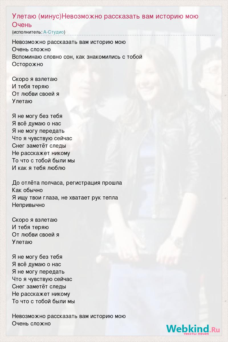 Главная→Исполнители→А-Студио→Улетаю (минус)Невозможно рассказать вам историю мою Очень сложно Вспомина