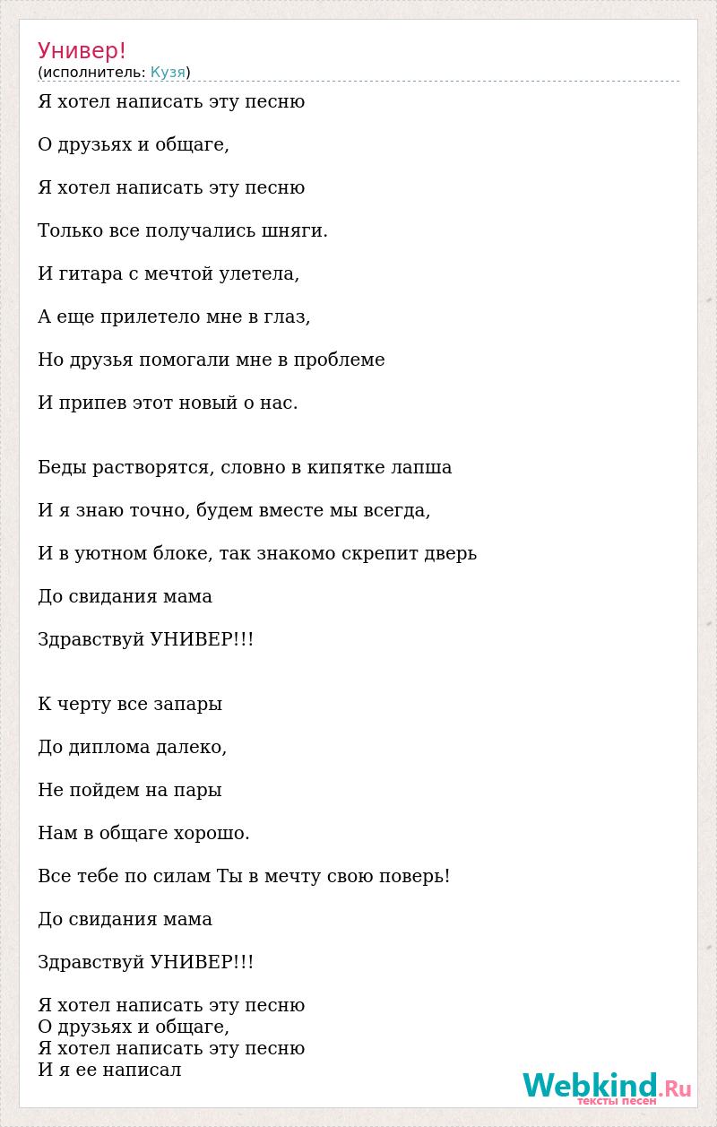 Я хотел написать эту песню О друзьях и общаге, Я хотел написать эту песню Только все получались шняги. И гитара с мечтой улетела, А еще прилетело мне в глаз, Но друзья помогали мне в проблеме И припев этот новый о нас. Беды растворятся, словно в кипятке лапша И я знаю точно, будем вместе мы всегда, И в уютном блоке, так знакомо скрепит дверь До свидания мама Здравствуй УНИВЕР!!! К черту все запары До диплома далеко, Не пойдем на пары Нам в общаге хорошо. Все тебе по силам Ты в мечту свою поверь! До свидания мама Здравствуй УНИВЕР!!! Я хотел написать эту песню О друзьях и общаге, Я хотел написать эту песню И я ее написал