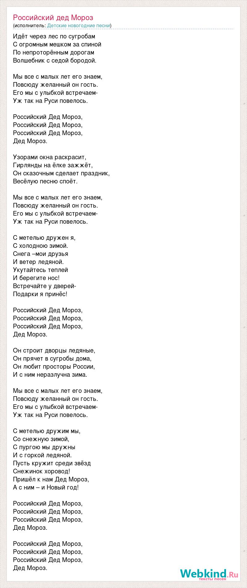 Идёт через лес по сугробам С огромным мешком за спиной По непроторённым дорогам Волшебник с седой бородой. Мы все с малых лет его знаем, Повсюду желанный он гость. Его мы с улыбкой встречаем- Уж так на Руси повелось. Российский Дед Мороз, Российский Дед Мороз, Российский Дед Мороз, Дед Мороз. Узорами окна раскрасит, Гирлянды на ёлке зажжёт, Он сказочным сделает праздник, Весёлую песню споёт. Мы все с малых лет его знаем, Повсюду желанный он гость. Его мы с улыбкой встречаем- Уж так на Руси повелось. С метелью дружен я, С холодною зимой. Снега –мои друзья И ветер ледяной. Укутайтесь теплей И берегите нос! Встречайте у дверей- Подарки я принёс! Российский Дед Мороз, Российский Дед Мороз, Российский Дед Мороз, Дед Мороз. Он строит дворцы ледяные, Он прячет в сугробы дома, Он любит просторы России, И с ним неразлучна зима. Мы все с малых лет его знаем, Повсюду желанный он гость. Его мы с улыбкой встречаем- Уж так на Руси повелось. С метелью дружим мы, Со снежную зимой, С пургою мы дружны И с горкой ледяной. Пусть кружит среди звёзд Снежинок хоровод! Пришёл к нам Дед Мороз, А с ним – и Новый год! Российский Дед Мороз, Российский Дед Мороз, Российский Дед Мороз, Дед Мороз. Российский Дед Мороз, Российский Дед Мороз, Российский Дед Мороз, Дед Мороз.