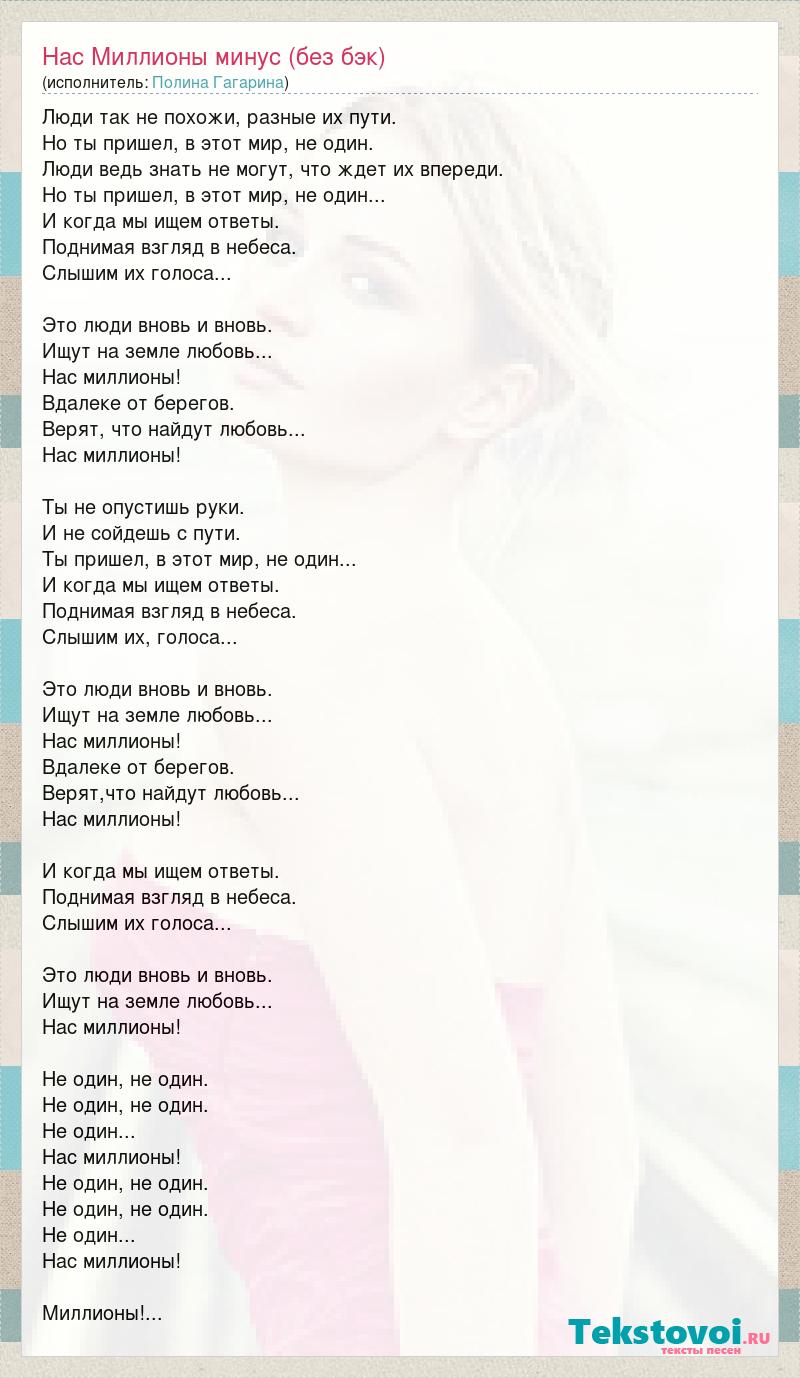 Люди так не похожи, разные их пути. Но ты пришел, в этот мир, не один. Люди ведь знать не могут, что ждет их впереди. Но ты пришел, в этот мир, не один... И когда мы ищем ответы. Поднимая взгляд в небеса. Слышим их голоса... Это люди вновь и вновь. Ищут на земле любовь... Нас миллионы! Вдалеке от берегов. Верят, что найдут любовь... Нас миллионы! Ты не опустишь руки. И не сойдешь с пути. Ты пришел, в этот мир, не один... И когда мы ищем ответы. Поднимая взгляд в небеса. Слышим их, голоса... Это люди вновь и вновь. Ищут на земле любовь... Нас миллионы! Вдалеке от берегов. Верят,что найдут любовь... Нас миллионы! И когда мы ищем ответы. Поднимая взгляд в небеса. Слышим их голоса... Это люди вновь и вновь. Ищут на земле любовь... Нас миллионы! Не один, не один. Не один, не один. Не один... Нас миллионы! Не один, не один. Не один, не один. Не один... Нас миллионы! Миллионы!...