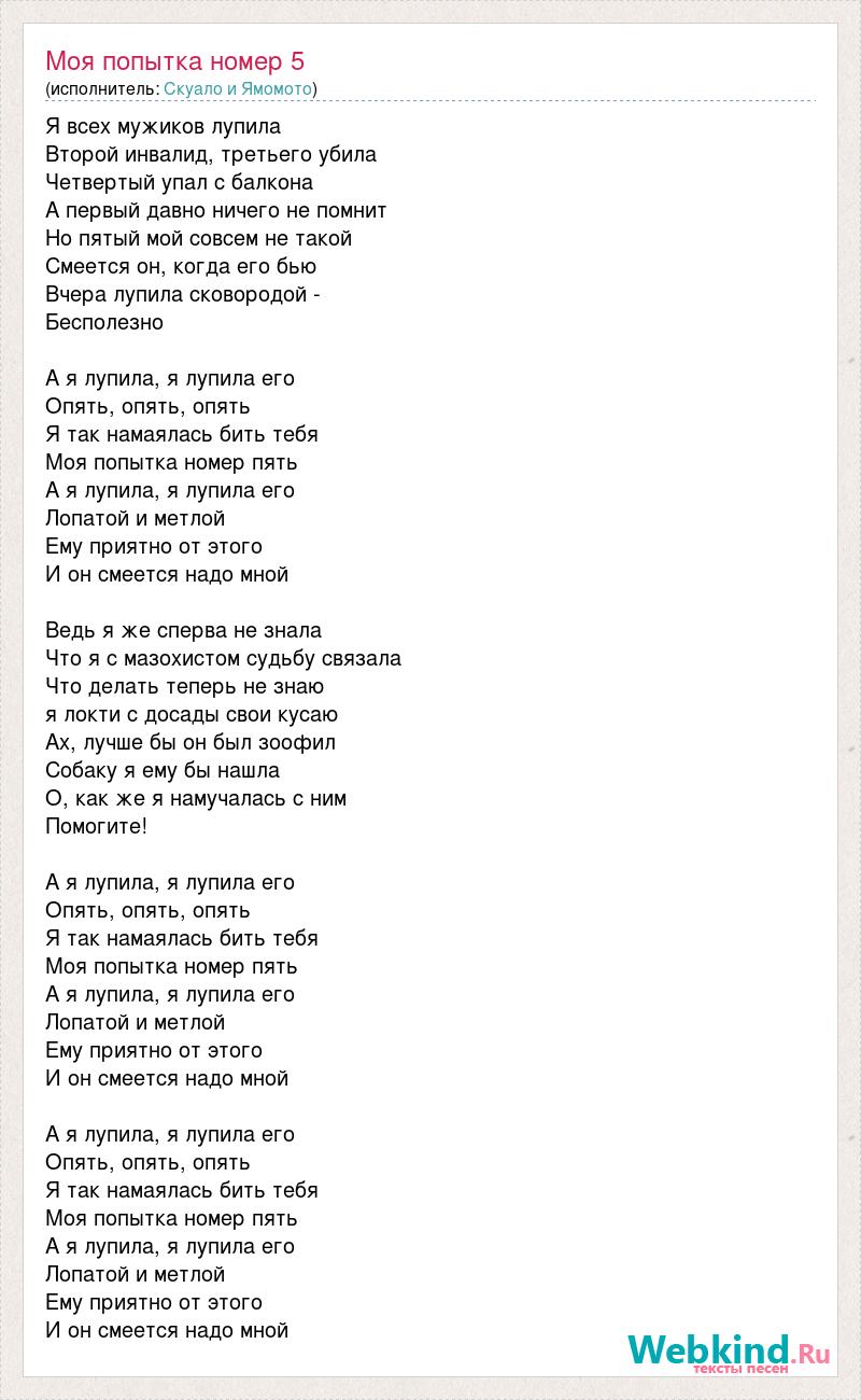 Я всех мужиков лупила Второй инвалид, третьего убила Четвертый упал с балкона А первый давно ничего не помнит Но пятый мой совсем не такой Смеется он, когда его бью Вчера лупила сковородой - Бесполезно А я лупила, я лупила его Опять, опять, опять Я так намаялась бить тебя Моя попытка номер пять А я лупила, я лупила его Лопатой и метлой Ему приятно от этого И он смеется надо мной Ведь я же сперва не знала Что я с мазохистом судьбу связала Что делать теперь не знаю я локти с досады свои кусаю Ах, лучше бы он был зоофил Собаку я ему бы нашла О, как же я намучалась с ним Помогите! А я лупила, я лупила его Опять, опять, опять Я так намаялась бить тебя Моя попытка номер пять А я лупила, я лупила его Лопатой и метлой Ему приятно от этого И он смеется надо мной А я лупила, я лупила его Опять, опять, опять Я так намаялась бить тебя Моя попытка номер пять А я лупила, я лупила его Лопатой и метлой Ему приятно от этого И он смеется надо мной