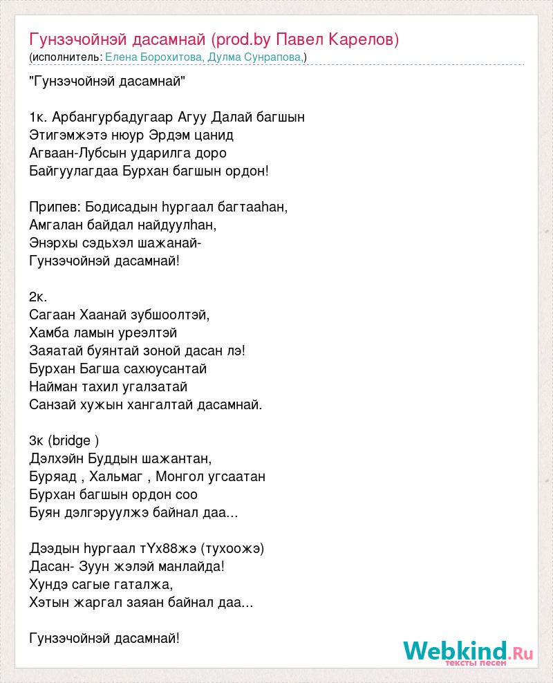"Гунзэчойнэй дасамнай" 1к. Арбангурбадугаар Агуу Далай багшын Этигэмжэтэ нюур Эрдэм цанид Агваан-Лубсын ударилга доро Байгуулагдаа Бурхан багшын ордон! Припев: Бодисадын hургаал багтааhан, Амгалан байдал найдуулhан, Энэрхы сэдьхэл шажанай- Гунзэчойнэй дасамнай! 2к. Сагаан Хаанай зубшоолтэй, Хамба ламын уреэлтэй Заяатай буянтай зоной дасан лэ! Бурхан Багша сахюусантай Найман тахил угалзатай Санзай хужын хангалтай дасамнай. 3к (bridge ) Дэлхэйн Буддын шажантан, Буряад , Хальмаг , Монгол угсаатан Бурхан багшын ордон соо Буян дэлгэруулжэ байнал даа... Дээдын hургаал тYх88жэ (тухоожэ) Дасан- Зуун жэлэй манлайда! Хундэ сагые гаталжа, Хэтын жаргал заяан байнал даа... Гунзэчойнэй дасамнай!