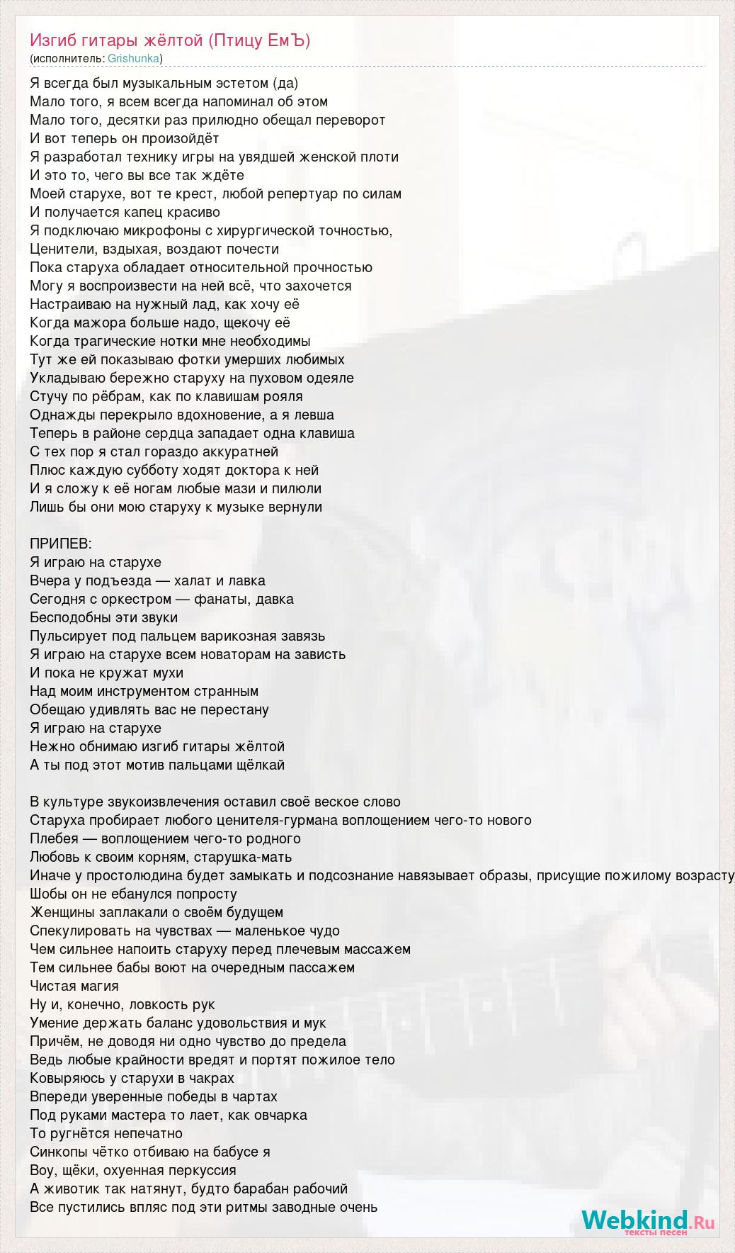Я всегда был музыкальным эстетом (да) Мало того, я всем всегда напоминал об этом Мало того, десятки раз прилюдно обещал переворот И вот теперь он произойдёт Я разработал технику игры на увядшей женской плоти И это то, чего вы все так ждёте Моей старухе, вот те крест, любой репертуар по силам И получается капец красиво Я подключаю микрофоны с хирургической точностью, Ценители, вздыхая, воздают почести Пока старуха обладает относительной прочностью Могу я воспроизвести на ней всё, что захочется Настраиваю на нужный лад, как хочу её Когда мажора больше надо, щекочу её Когда трагические нотки мне необходимы Тут же ей показываю фотки умерших любимых Укладываю бережно старуху на пуховом одеяле Стучу по рёбрам, как по клавишам рояля Однажды перекрыло вдохновение, а я левша Теперь в районе сердца западает одна клавиша С тех пор я стал гораздо аккуратней Плюс каждую субботу ходят доктора к ней И я сложу к её ногам любые мази и пилюли Лишь бы они мою старуху к музыке вернули ПРИПЕВ: Я играю на старухе Вчера у подъезда — халат и лавка Сегодня с оркестром — фанаты, давка Бесподобны эти звуки Пульсирует под пальцем варикозная завязь Я играю на старухе всем новаторам на зависть И пока не кружат мухи Над моим инструментом странным Обещаю удивлять вас не перестану Я играю на старухе Нежно обнимаю изгиб гитары жёлтой А ты под этот мотив пальца́ми щёлкай В культуре звукоизвлечения оставил своё веское слово Старуха пробирает любого ценителя-гурмана воплощением чего-то нового Плебея — воплощением чего-то родного Любовь к своим корням, старушка-мать Иначе у простолюдина будет замыкать и подсознание навязывает образы, присущие пожилому возрасту Шобы он не ебанулся попросту Женщины заплакали о своём будущем Спекулировать на чувствах — маленькое чудо Чем сильнее напоить старуху перед плечевым массажем Тем сильнее бабы воют на очередным пассажем Чистая магия Ну и, конечно, ловкость рук Умение держать баланс удовольствия и мук Причём, не доводя ни одно чувство до предела Ведь любые крайности вредят и портят пожилое тело Ковыряюсь у старухи в чакрах Впереди уверенные победы в чартах Под руками мастера то лает, как овчарка То ругнётся непечатно Синкопы чётко отбиваю на бабусе я Воу, щёки, охуенная перкуссия А животик так натянут, будто барабан рабочий Все пустились впляс под эти ритмы заводные очень
