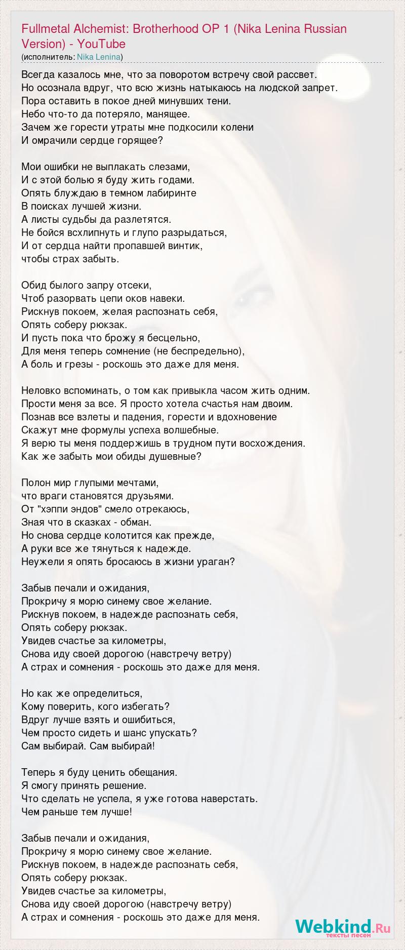 Всегда казалось мне, что за поворотом встречу свой рассвет. Но осознала вдруг, что всю жизнь натыкаюсь на людской запрет. Пора оставить в покое дней минувших тени. Небо что-то да потеряло, манящее. Зачем же горести утраты мне подкосили колени И омрачили сердце горящее? Мои ошибки не выплакать слезами, И с этой болью я буду жить годами. Опять блуждаю в темном лабиринте В поисках лучшей жизни. А листы судьбы да разлетятся. Не бойся всхлипнуть и глупо разрыдаться, И от сердца найти пропавшей винтик, чтобы страх забыть. Обид былого запру отсеки, Чтоб разорвать цепи оков навеки. Рискнув покоем, желая распознать себя, Опять соберу рюкзак. И пусть пока что брожу я бесцельно, Для меня теперь сомнение (не беспредельно), А боль и грезы - роскошь это даже для меня. Неловко вспоминать, о том как привыкла часом жить одним. Прости меня за все. Я просто хотела счастья нам двоим. Познав все взлеты и падения, горести и вдохновение Скажут мне формулы успеха волшебные. Я верю ты меня поддержишь в трудном пути восхождения. Как же забыть мои обиды душевные? Полон мир глупыми мечтами, что враги становятся друзьями. От "хэппи эндов" смело отрекаюсь, Зная что в сказках - обман. Но снова сердце колотится как прежде, А руки все же тянуться к надежде. Неужели я опять бросаюсь в жизни ураган? Забыв печали и ожидания, Прокричу я морю синему свое желание. Рискнув покоем, в надежде распознать себя, Опять соберу рюкзак. Увидев счастье за километры, Снова иду своей дорогою (навстречу ветру) А страх и сомнения - роскошь это даже для меня. Но как же определиться, Кому поверить, кого избегать? Вдруг лучше взять и ошибиться, Чем просто сидеть и шанс упускать? Сам выбирай. Сам выбирай! Теперь я буду ценить обещания. Я смогу принять решение. Что сделать не успела, я уже готова наверстать. Чем раньше тем лучше! Забыв печали и ожидания, Прокричу я морю синему свое желание. Рискнув покоем, в надежде распознать себя, Опять соберу рюкзак. Увидев счастье за километры, Снова иду своей дорогою (навстречу ветру) А страх и сомнения - роскошь это даже для меня.