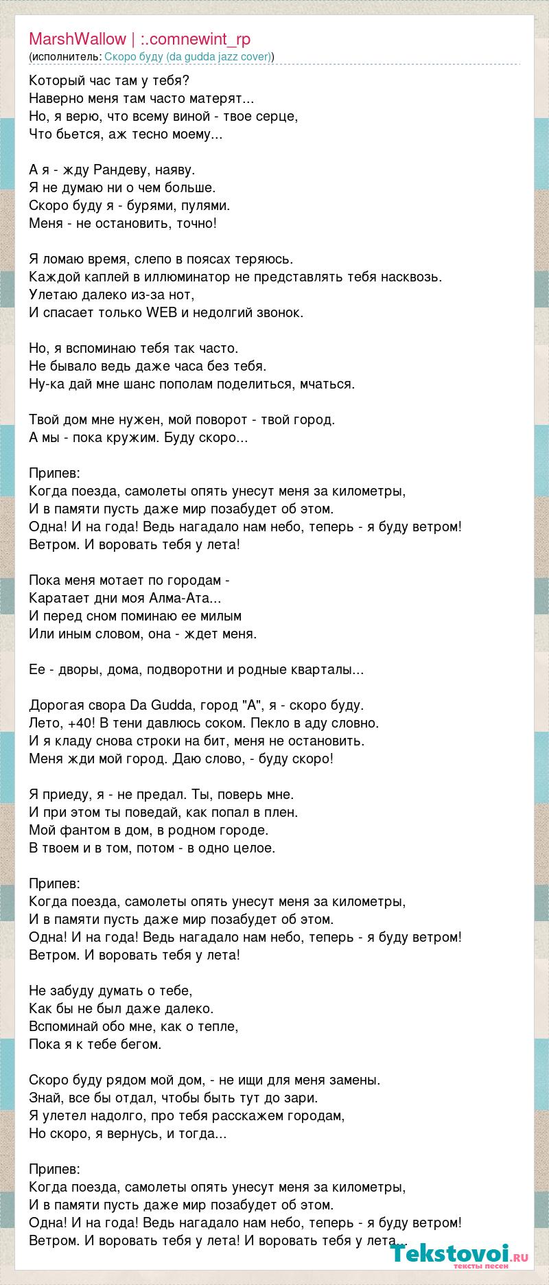 Который час там у тебя? Наверно меня там часто матерят... Но, я верю, что всему виной - твое серце, Что бьется, аж тесно моему... А я - жду Рандеву, наяву. Я не думаю ни о чем больше. Скоро буду я - бурями, пулями. Меня - не остановить, точно! Я ломаю время, слепо в поясах теряюсь. Каждой каплей в иллюминатор не представлять тебя насквозь. Улетаю далеко из-за нот, И спасает только WEB и недолгий звонок. Но, я вспоминаю тебя так часто. Не бывало ведь даже часа без тебя. Ну-ка дай мне шанс пополам поделиться, мчаться. Твой дом мне нужен, мой поворот - твой город. А мы - пока кружим. Буду скоро... Припев: Когда поезда, самолеты опять унесут меня за километры, И в памяти пусть даже мир позабудет об этом. Одна! И на года! Ведь нагадало нам небо, теперь - я буду ветром! Ветром. И воровать тебя у лета! Пока меня мотает по городам - Каратает дни моя Алма-Ата... И перед сном поминаю ее милым Или иным словом, она - ждет меня. Ее - дворы, дома, подворотни и родные кварталы... Дорогая свора Da Gudda, город "А", я - скоро буду. Лето, +40! В тени давлюсь соком. Пекло в аду словно. И я кладу снова строки на бит, меня не остановить. Меня жди мой город. Даю слово, - буду скоро! Я приеду, я - не предал. Ты, поверь мне. И при этом ты поведай, как попал в плен. Мой фантом в дом, в родном городе. В твоем и в том, потом - в одно целое. Припев: Когда поезда, самолеты опять унесут меня за километры, И в памяти пусть даже мир позабудет об этом. Одна! И на года! Ведь нагадало нам небо, теперь - я буду ветром! Ветром. И воровать тебя у лета! Не забуду думать о тебе, Как бы не был даже далеко. Вспоминай обо мне, как о тепле, Пока я к тебе бегом. Скоро буду рядом мой дом, - не ищи для меня замены. Знай, все бы отдал, чтобы быть тут до зари. Я улетел надолго, про тебя расскажем городам, Но скоро, я вернусь, и тогда... Припев: Когда поезда, самолеты опять унесут меня за километры, И в памяти пусть даже мир позабудет об этом. Одна! И на года! Ведь нагадало нам небо, теперь - я буду ветром! Ветром. И воровать тебя у лета! И воровать тебя у лета...