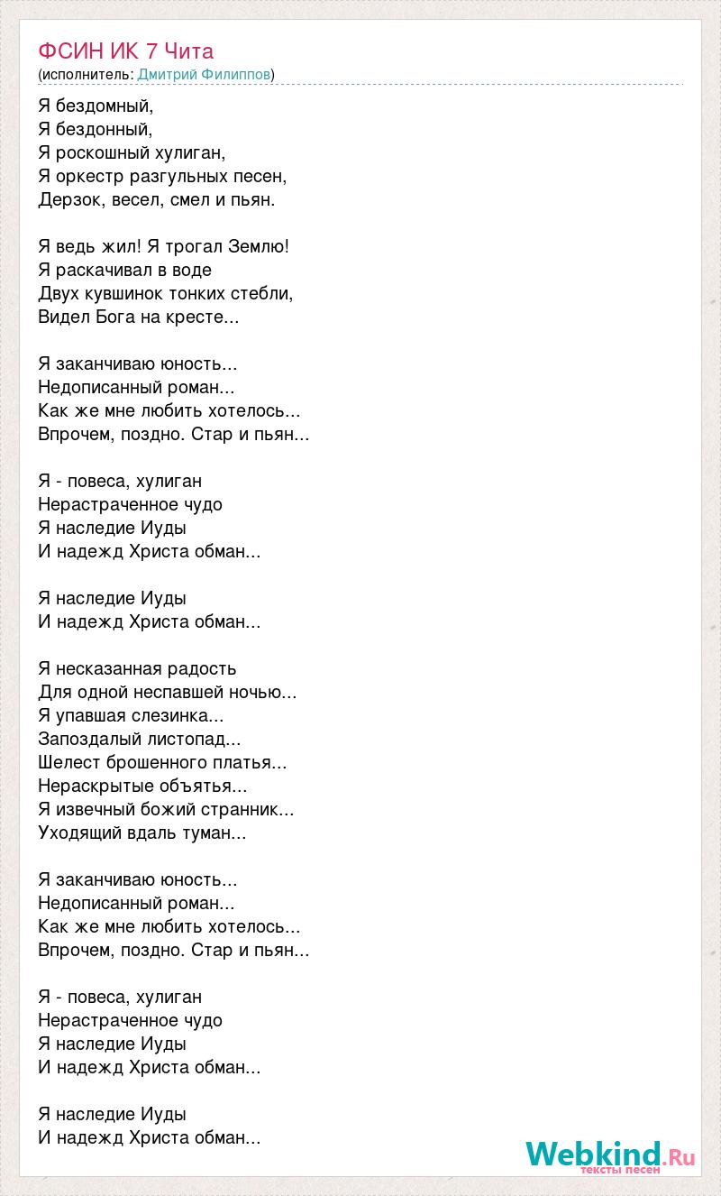 Я бездомный, Я бездонный, Я роскошный хулиган, Я оркестр разгульных песен, Дерзок, весел, смел и пьян. Я ведь жил! Я трогал Землю! Я раскачивал в воде Двух кувшинок тонких стебли, Видел Бога на кресте... Я заканчиваю юность... Недописанный роман... Как же мне любить хотелось... Впрочем, поздно. Стар и пьян... Я - повеса, хулиган Нерастраченное чудо Я наследие Иуды И надежд Христа обман... Я наследие Иуды И надежд Христа обман... Я несказанная радость Для одной неспавшей ночью... Я упавшая слезинка... Запоздалый листопад... Шелест брошенного платья... Нераскрытые объятья... Я извечный божий странник... Уходящий вдаль туман... Я заканчиваю юность... Недописанный роман... Как же мне любить хотелось... Впрочем, поздно. Стар и пьян... Я - повеса, хулиган Нерастраченное чудо Я наследие Иуды И надежд Христа обман... Я наследие Иуды И надежд Христа обман...