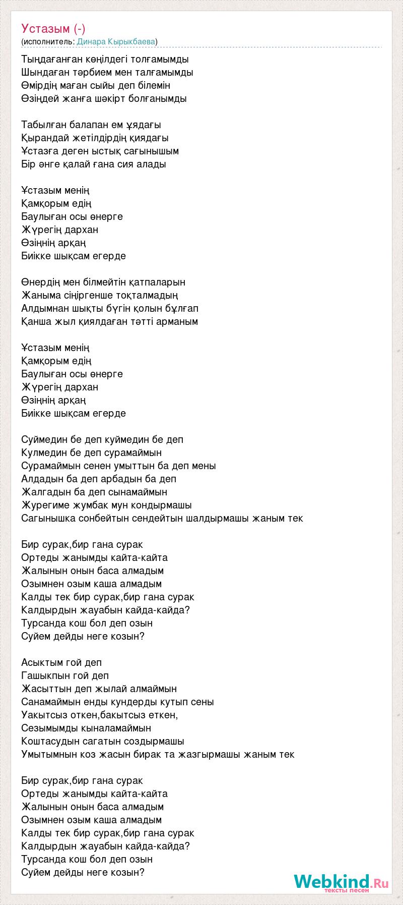 Тыңдағанған көңілдегі толғамымды Шындаған тәрбием мен талғамымды Өмірдің маған сыйы деп білемін Өзіңдей жанға шәкірт болғанымды Табылған балапан ем ұядағы Қырандай жетілдірдің қиядағы Ұстазға деген ыстық сағынышым Бір әнге қалай ғана сия алады Ұстазым менің Қамқорым едің Баулыған осы өнерге Жүрегің дархан Өзіңнің арқаң Биікке шықсам егерде Өнердің мен білмейтін қатпаларын Жаныма сіңіргенше тоқталмадың Алдымнан шықты бүгін қолын бұлғап Қанша жыл қиялдаған тәтті арманым Ұстазым менің Қамқорым едің Баулыған осы өнерге Жүрегің дархан Өзіңнің арқаң Биікке шықсам егерде Суймедин бе деп куймедин бе деп Кулмедин бе деп сурамаймын Сурамаймын сенен умыттын ба деп мены Алдадын ба деп арбадын ба деп Жалгадын ба деп сынамаймын Журегиме жумбак мун кондырмашы Сагынышка сонбейтын сендейтын шалдырмашы жаным тек Бир сурак,бир гана сурак Ортеды жанымды кайта-кайта Жалынын онын баса алмадым Озымнен озым каша алмадым Калды тек бир сурак,бир гана сурак Калдырдын жауабын кайда-кайда? Турсанда кош бол деп озын Суйем дейды неге козын? Асыктым гой деп Гашыкпын гой деп Жасыттын деп жылай алмаймын Санамаймын енды кундерды кутып сены Уакытсыз откен,бакытсыз еткен, Сезымымды кыналамаймын Коштасудын сагатын создырмашы Умытымнын коз жасын бирак та жазгырмашы жаным тек Бир сурак,бир гана сурак Ортеды жанымды кайта-кайта Жалынын онын баса алмадым Озымнен озым каша алмадым Калды тек бир сурак,бир гана сурак Калдырдын жауабын кайда-кайда? Турсанда кош бол деп озын Суйем дейды неге козын?