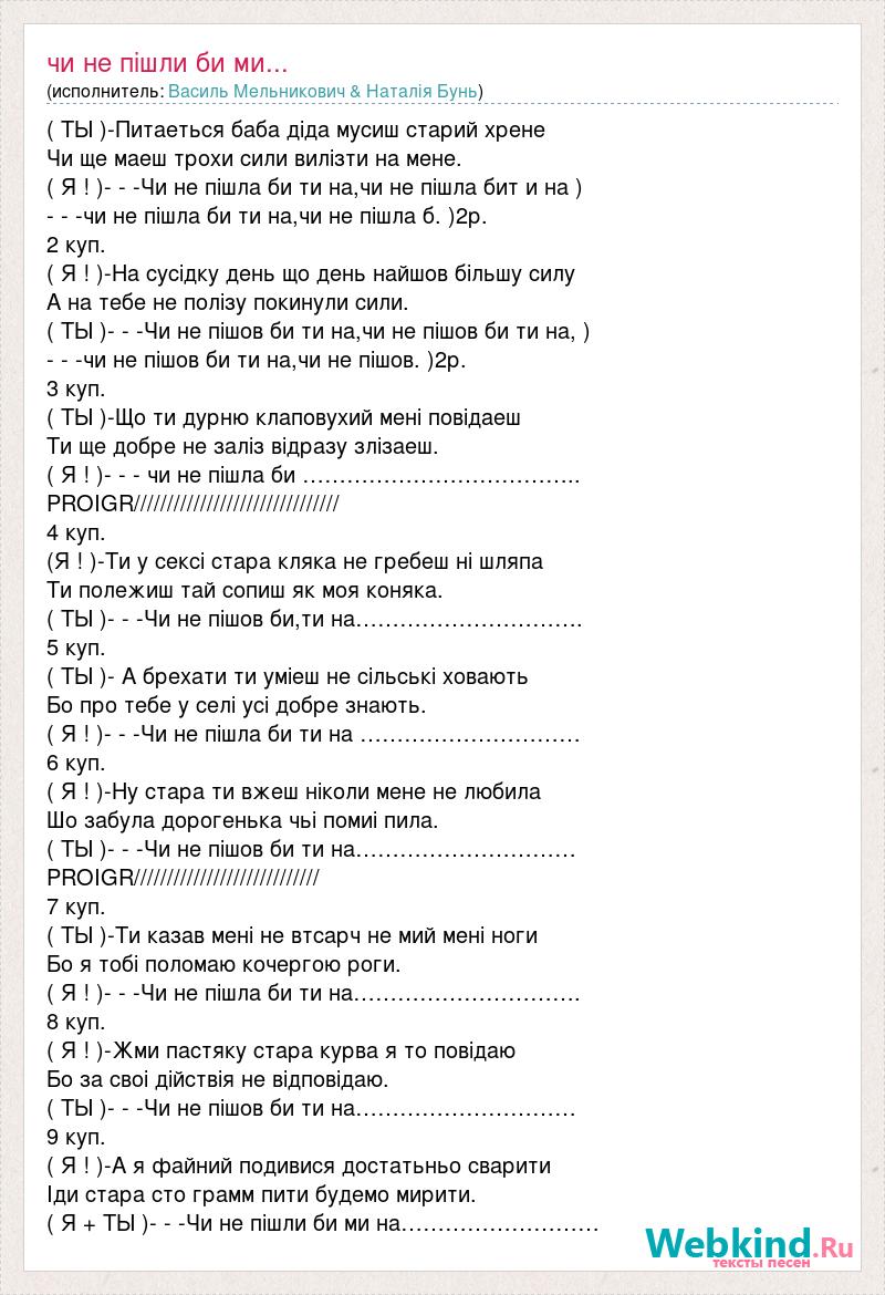 ( ТЫ )-Питаеться баба дiда мусиш старий хрене Чи ще маеш трохи сили вилiзти на мене. ( Я ! )- - -Чи не пiшла би ти на,чи не пiшла бит и на ) - - -чи не пiшла би ти на,чи не пiшла б. )2р. 2 куп. ( Я ! )-На сусiдку день що день найшов бiльшу силу А на тебе не полiзу покинули сили. ( ТЫ )- - -Чи не пiшов би ти на,чи не пiшов би ти на, ) - - -чи не пiшов би ти на,чи не пiшов. )2р. 3 куп. ( ТЫ )-Що ти дурню клаповухий менi повiдаеш Ти ще добре не залiз вiдразу злiзаеш. ( Я ! )- - - чи не пiшла би ……………………………….. PROIGR/////////////////////////////// 4 куп. (Я ! )-Ти у сексi стара кляка не гребеш нi шляпа Ти полежиш тай сопиш як моя коняка. ( ТЫ )- - -Чи не пiшов би,ти на…………………………. 5 куп. ( ТЫ )- А брехати ти умiеш не сiльськi ховають Бо про тебе у селi усi добре знають. ( Я ! )- - -Чи не пiшла би ти на ………………………… 6 куп. ( Я ! )-Ну стара ти вжеш нiколи мене не любила Шо забула дорогенька чьi помиi пила. ( ТЫ )- - -Чи не пiшов би ти на………………………… PROIGR//////////////////////////// 7 куп. ( ТЫ )-Ти казав менi не втсарч не мий менi ноги Бо я тобi поломаю кочергою роги. ( Я ! )- - -Чи не пiшла би ти на…………………………. 8 куп. ( Я ! )-Жми пастяку стара курва я то повiдаю Бо за своi дiйствiя не вiдповiдаю. ( ТЫ )- - -Чи не пiшов би ти на………………………… 9 куп. ( Я ! )-А я файний подивися достатьньо сварити Iди стара сто грамм пити будемо мирити. ( Я + ТЫ )- - -Чи не пiшли би ми на………………………