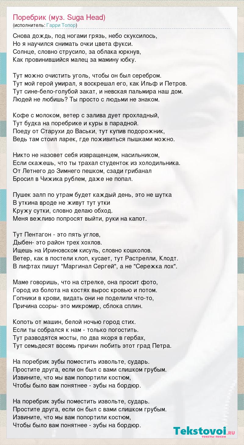 Снова дождь, под ногами грязь, небо скуксилось, Но я научился снимать очки цвета фукси. Солнце, словно струсило, за облака юркнув, Как провинившийся малец за мамину юбку. Тут можно очистить уголь, чтобы он был серебром. Тут мой герой умирал, я воскрешал его, как Ильф и Петров. Тут сине-бело-голубой закат, и невская пальмира наш дом. Людей не любишь? Ты просто с людьми не знаком. Кофе с молоком, ветер с залива дует прохладный, Тут будка на поребрике и куры в парадной. Поеду от Старухи до Васьки, тут купив подорожник, Ведь там стоил ларек, где поживиться пышками можно. Никто не назовет себя извращенцем, насильником, Если скажешь, что ты трахал студенток из холодильника. От Летнего до Зимнего пешком, сзади грибанал Бросил в Чижика рублем, даже не попал. Пушек залп по утрам будет каждый день, это не шутка В уткина вроде не живут тут утки Кружу сутки, словно делаю обход. Меня вежливо попросят выйти, руки на капот. Тут Пентагон - это пять углов, Дыбен- это район трех хохлов. Ищешь на Ириновском кисуль, словно кошколов. Ветер, как в постели клоп, кусает, тут Растрелли, Клодт. В лифтах пишут "Маргинал Сергей", а не "Сережка лох". Маме говоришь, что на стрелке, она просит фото, Город из болота на костях вырос кровью и потом. Гопники в крови, видать они не поделили что-то, Причина ссоры- это микромир, сблока сплин. Копоть от машин, белой ночью город стих. Если ты собрался к нам - только погостить. Тут разводятся мосты, по два якоря в гербах, Тут семьдесят восемь причин любить этот град Петра. На поребрик зубы поместить извольте, сударь. Простите друга, если он был с вами слишком грубым. Извините, что мы вам попортили костюм, Чтобы было вам понятнее - зубы на бордюр. На поребрик зубы поместить извольте, сударь. Простите друга, если он был с вами слишком грубым. Извините, что мы вам попортили костюм, Чтобы было вам понятнее - зубы на бордюр.