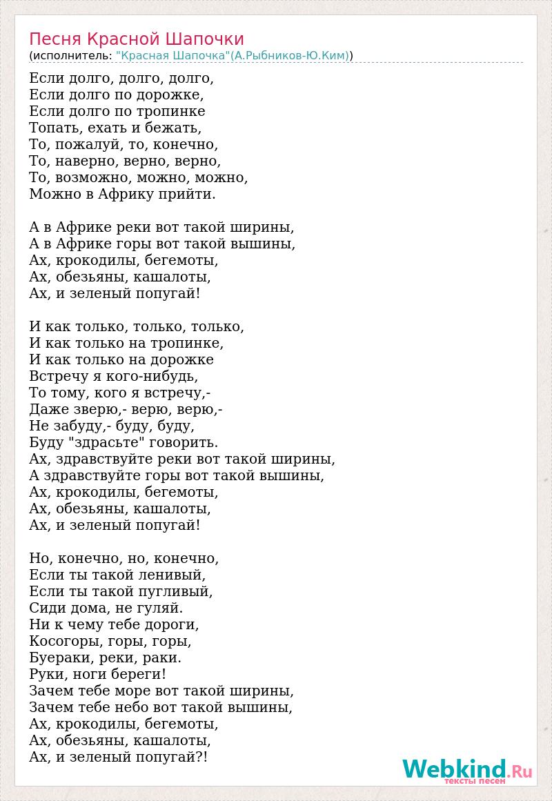 Если долго, долго, долго, Если долго по дорожке, Если долго по тропинке Топать, ехать и бежать, То, пожалуй, то, конечно, То, наверно, верно, верно, То, возможно, можно, можно, Можно в Африку прийти. А в Африке реки вот такой ширины, А в Африке горы вот такой вышины, Ах, крокодилы, бегемоты, Ах, обезьяны, кашалоты, Ах, и зеленый попугай! И как только, только, только, И как только на тропинке, И как только на дорожке Встречу я кого-нибудь, То тому, кого я встречу,- Даже зверю,- верю, верю,- Не забуду,- буду, буду, Буду "здрасьте" говорить. Ах, здравствуйте реки вот такой ширины, А здравствуйте горы вот такой вышины, Ах, крокодилы, бегемоты, Ах, обезьяны, кашалоты, Ах, и зеленый попугай! Но, конечно, но, конечно, Если ты такой ленивый, Если ты такой пугливый, Сиди дома, не гуляй. Ни к чему тебе дороги, Косогоры, горы, горы, Буераки, реки, раки. Руки, ноги береги! Зачем тебе море вот такой ширины, Зачем тебе небо вот такой вышины, Ах, крокодилы, бегемоты, Ах, обезьяны, кашалоты, Ах, и зеленый попугай?!