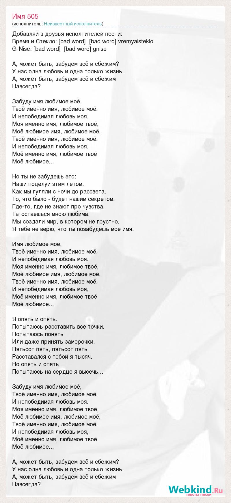 Добавляй в друзья исполнителей песни: Время и Стекло: [bad word] [bad word] vremyaisteklo G-Nise: [bad word] [bad word] gnise А, может быть, забудем всё и сбежим? У нас одна любовь и одна только жизнь. А, может быть, забудем всё и сбежим Навсегда? Забуду имя любимое моё, Твоё именно имя, любимое моё. И непобедимая любовь моя. Моя именно имя, любимое твоё, Моё любимое имя, любимое моё, Твоё именно имя, любимое моё. И непобедимая любовь моя, Моё именно имя, любимое твоё Моё любимое... Но ты не забудешь это: Наши поцелуи этим летом. Как мы гуляли с ночи до рассвета. То, что было - будет нашим секретом. Где-то, где не знают про чувства, Ты остаешься мною любима. Мы создали мир, в котором не грустно. Я тебе не верю, что ты позабудешь мое имя. Имя любимое моё, Твоё именно имя, любимое моё. И непобедимая любовь моя. Моя именно имя, любимое твоё, Моё любимое имя, любимое моё, Твоё именно имя, любимое моё. И непобедимая любовь моя, Моё именно имя, любимое твоё Моё любимое... Я опять и опять. Попытаюсь расставить все точки. Попытаюсь понять Или даже принять заморочки. Пятьсот пять, пятьсот пять Расставался с тобой я тысяч. Но опять и опять Попытаюсь на сердце я высечь... Забуду имя любимое моё, Твоё именно имя, любимое моё. И непобедимая любовь моя. Моя именно имя, любимое твоё, Моё любимое имя, любимое моё, Твоё именно имя, любимое моё. И непобедимая любовь моя, Моё именно имя, любимое твоё Моё любимое... А, может быть, забудем всё и сбежим? У нас одна любовь и одна только жизнь. А, может быть, забудем всё и сбежим Навсегда?