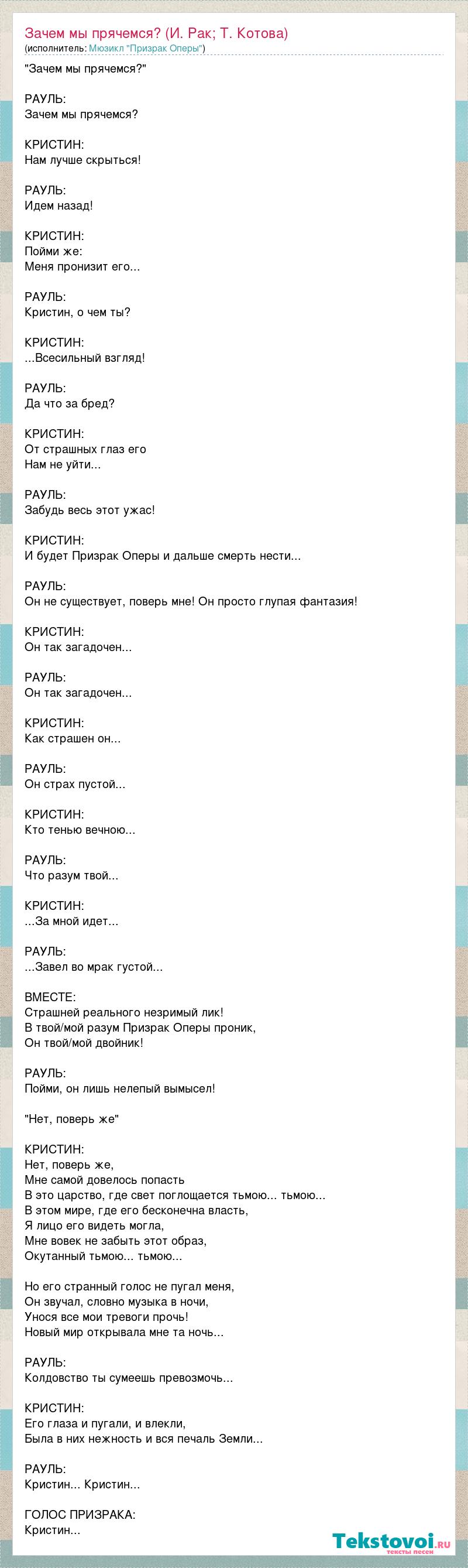 "Зачем мы прячемся?" РАУЛЬ: Зачем мы прячемся? КРИСТИН: Нам лучше скрыться! РАУЛЬ: Идем назад! КРИСТИН: Пойми же: Меня пронизит его... РАУЛЬ: Кристин, о чем ты? КРИСТИН: ...Всесильный взгляд! РАУЛЬ: Да что за бред? КРИСТИН: От страшных глаз его Нам не уйти... РАУЛЬ: Забудь весь этот ужас! КРИСТИН: И будет Призрак Оперы и дальше смерть нести... РАУЛЬ: Он не существует, поверь мне! Он просто глупая фантазия! КРИСТИН: Он так загадочен... РАУЛЬ: Он так загадочен... КРИСТИН: Как страшен он... РАУЛЬ: Он страх пустой... КРИСТИН: Кто тенью вечною... РАУЛЬ: Что разум твой... КРИСТИН: ...За мной идет... РАУЛЬ: ...Завел во мрак густой... ВМЕСТЕ: Страшней реального незримый лик! В твой/мой разум Призрак Оперы проник, Он твой/мой двойник! РАУЛЬ: Пойми, он лишь нелепый вымысел! "Нет, поверь же" КРИСТИН: Нет, поверь же, Мне самой довелось попасть В это царство, где свет поглощается тьмою... тьмою... В этом мире, где его бесконечна власть, Я лицо его видеть могла, Мне вовек не забыть этот образ, Окутанный тьмою... тьмою... Но его странный голос не пугал меня, Он звучал, словно музыка в ночи, Унося все мои тревоги прочь! Новый мир открывала мне та ночь... РАУЛЬ: Колдовство ты сумеешь превозмочь... КРИСТИН: Его глаза и пугали, и влекли, Была в них нежность и вся печаль Земли... РАУЛЬ: Кристин... Кристин... ГОЛОС ПРИЗРАКА: Кристин...