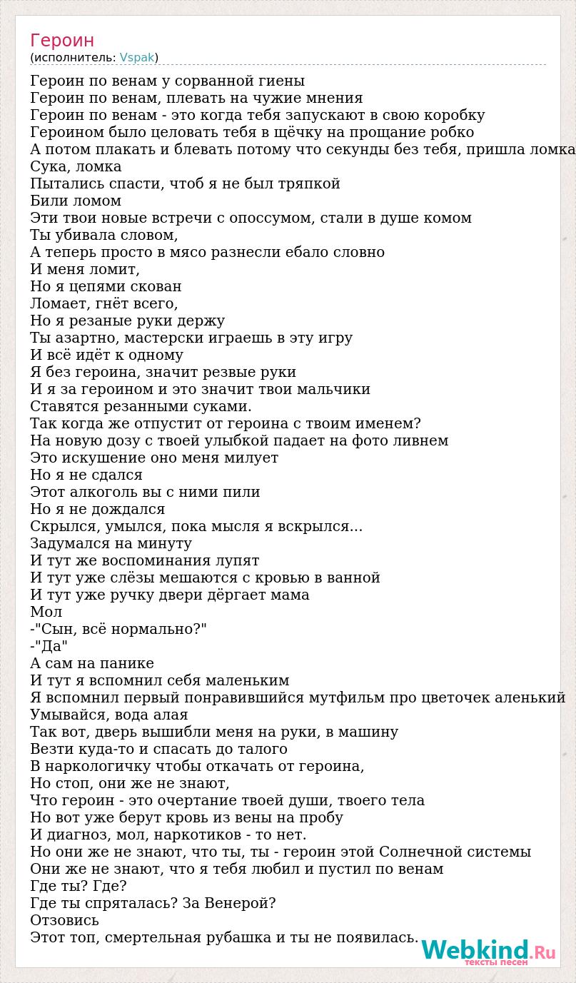 Героин по венам у сорванной гиены Героин по венам, плевать на чужие мнения Героин по венам - это когда тебя запускают в свою коробку Героином было целовать тебя в щёчку на прощание робко А потом плакать и блевать потому что секунды без тебя, пришла ломка Сука, ломка Пытались спасти, чтоб я не был тряпкой Били ломом Эти твои новые встречи с опоссумом, стали в душе комом Ты убивала словом, А теперь просто в мясо разнесли ебало словно И меня ломит, Но я цепями скован Ломает, гнёт всего, Но я резаные руки держу Ты азартно, мастерски играешь в эту игру И всё идёт к одному Я без героина, значит резвые руки И я за героином и это значит твои мальчики Ставятся резанными суками. Так когда же отпустит от героина с твоим именем? На новую дозу с твоей улыбкой падает на фото ливнем Это искушение оно меня милует Но я не сдался Этот алкоголь вы с ними пили Но я не дождался Скрылся, умылся, пока мысля я вскрылся... Задумался на минуту И тут же воспоминания лупят И тут уже слёзы мешаются с кровью в ванной И тут уже ручку двери дёргает мама Мол -"Сын, всё нормально?" -"Да" А сам на панике И тут я вспомнил себя маленьким Я вспомнил первый понравившийся мутфильм про цветочек аленький Умывайся, вода алая Так вот, дверь вышибли меня на руки, в машину Везти куда-то и спасать до талого В наркологичку чтобы откачать от героина, Но стоп, они же не знают, Что героин - это очертание твоей души, твоего тела Но вот уже берут кровь из вены на пробу И диагноз, мол, наркотиков - то нет. Но они же не знают, что ты, ты - героин этой Солнечной системы Они же не знают, что я тебя любил и пустил по венам Где ты? Где? Где ты спряталась? За Венерой? Отзовись Этот топ, смертельная рубашка и ты не появилась.