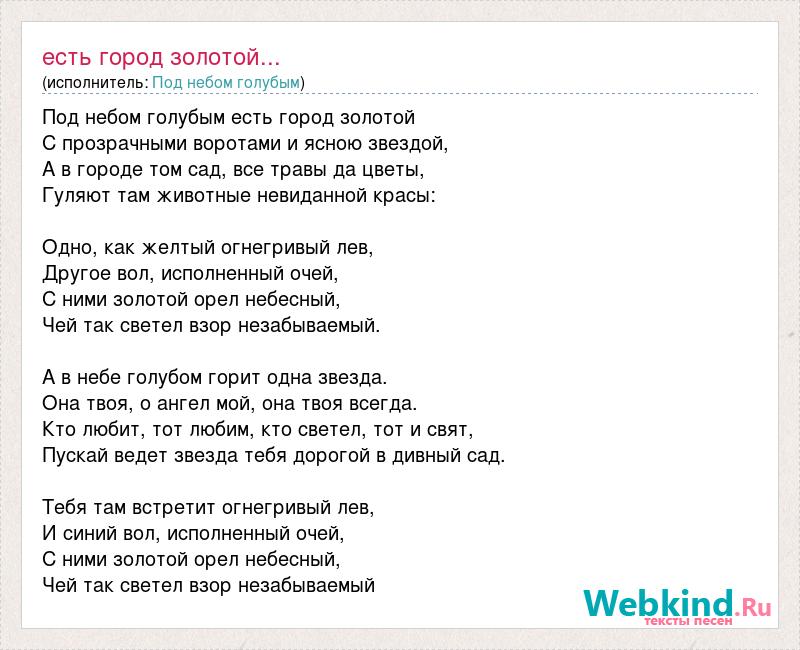 Под небом голубым есть город золотой С прозрачными воротами и ясною звездой, А в городе том сад, все травы да цветы, Гуляют там животные невиданной красы: Одно, как желтый огнегривый лев, Другое вол, исполненный очей, С ними золотой орел небесный, Чей так светел взор незабываемый. А в небе голубом горит одна звезда. Она твоя, о ангел мой, она твоя всегда. Кто любит, тот любим, кто светел, тот и свят, Пускай ведет звезда тебя дорогой в дивный сад. Тебя там встретит огнегривый лев, И синий вол, исполненный очей, С ними золотой орел небесный, Чей так светел взор незабываемый