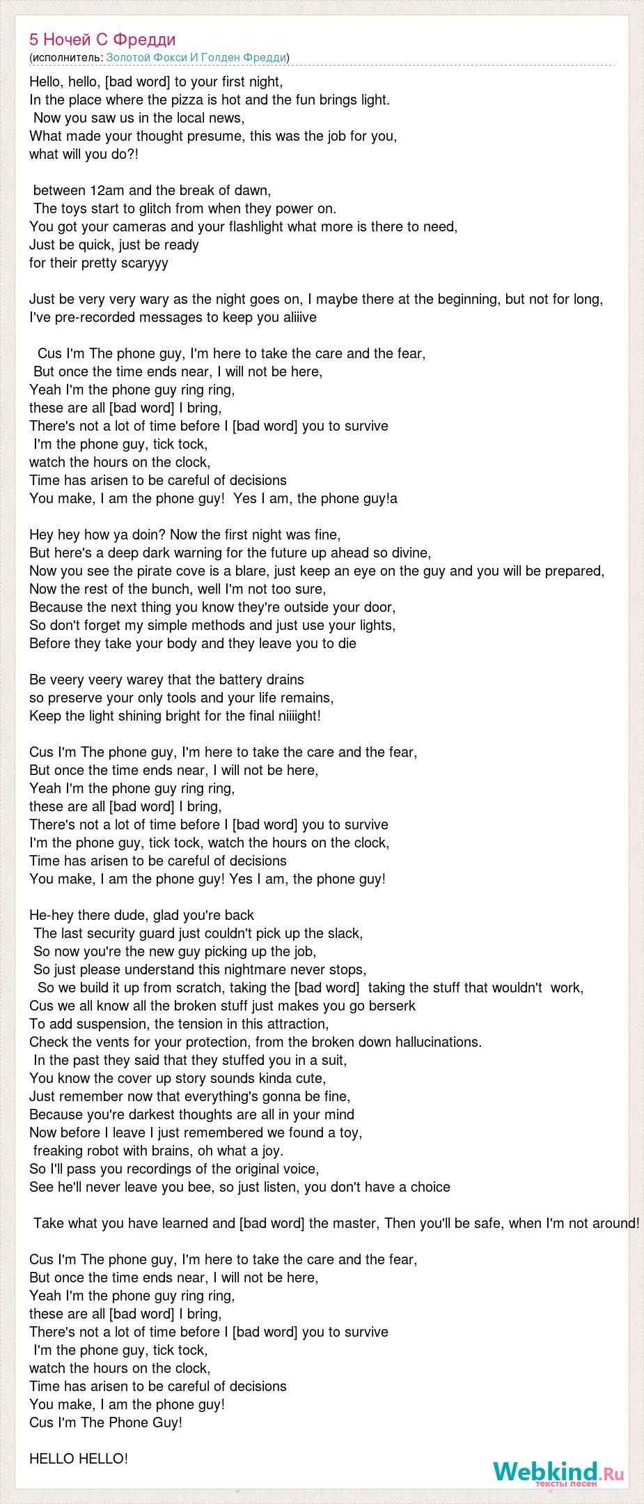 Hello, hello, [bad word] to your first night, In the place where the pizza is hot and the fun brings light. Now you saw us in the local news, What made your thought presume, this was the job for you, what will you do?! between 12am and the break of dawn, The toys start to glitch from when they power on. You got your cameras and your flashlight what more is there to need, Just be quick, just be ready for their pretty scaryyy Just be very very wary as the night goes on, I maybe there at the beginning, but not for long, I've pre-recorded messages to keep you aliiive Cus I'm The phone guy, I'm here to take the care and the fear, But once the time ends near, I will not be here, Yeah I'm the phone guy ring ring, these are all [bad word] I bring, There's not a lot of time before I [bad word] you to survive I'm the phone guy, tick tock, watch the hours on the clock, Time has arisen to be careful of decisions You make, I am the phone guy! Yes I am, the phone guy!a Hey hey how ya doin? Now the first night was fine, But here's a deep dark warning for the future up ahead so divine, Now you see the pirate cove is a blare, just keep an eye on the guy and you will be prepared, Now the rest of the bunch, well I'm not too sure, Because the next thing you know they're outside your door, So don't forget my simple methods and just use your lights, Before they take your body and they leave you to die Be veery veery warey that the battery drains so preserve your only tools and your life remains, Keep the light shining bright for the final niiiight! Cus I'm The phone guy, I'm here to take the care and the fear, But once the time ends near, I will not be here, Yeah I'm the phone guy ring ring, these are all [bad word] I bring, There's not a lot of time before I [bad word] you to survive I'm the phone guy, tick tock, watch the hours on the clock, Time has arisen to be careful of decisions You make, I am the phone guy! Yes I am, the phone guy! He-hey there dude, glad you're back The last security guard just couldn't pick up the slack, So now you're the new guy picking up the job, So just please understand this nightmare never stops, So we build it up from scratch, taking the [bad word] taking the stuff that wouldn't work, Cus we all know all the broken stuff just makes you go berserk To add suspension, the tension in this attraction, Check the vents for your protection, from the broken down hallucinations. In the past they said that they stuffed you in a suit, You know the cover up story sounds kinda cute, Just remember now that everything's gonna be fine, Because you're darkest thoughts are all in your mind Now before I leave I just remembered we found a toy, freaking robot with brains, oh what a joy. So I'll pass you recordings of the original voice, See he'll never leave you bee, so just listen, you don't have a choice Take what you have learned and [bad word] the master, Then you'll be safe, when I'm not around! Cus I'm The phone guy, I'm here to take the care and the fear, But once the time ends near, I will not be here, Yeah I'm the phone guy ring ring, these are all [bad word] I bring, There's not a lot of time before I [bad word] you to survive I'm the phone guy, tick tock, watch the hours on the clock, Time has arisen to be careful of decisions You make, I am the phone guy! Cus I'm The Phone Guy! HELLO HELLO!