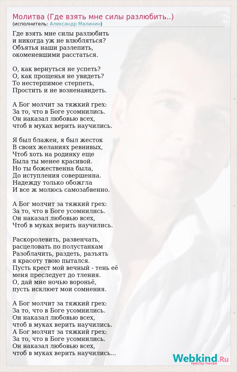 Где взять мне силы разлюбить и никогда уж не влюбляться? Объятья наши разлепить, окоменевшими расстаться. О, как вернуться не успеть? О, как прощенья не увидеть? То нестерпимое стерпеть, Простить и не возненавидеть. А Бог молчит за тяжкий грех: За то, что в Боге усомнились. Он наказал любовью всех, чтоб в муках верить научились. Я был блажен, я был жесток В своих желаниях ревнивых, Чтоб хоть на родинку еще Была ты менее красивой. Но ты божественна была, До иступления совершенна. Надежду только обожгла И все ж молюсь самозабвенно. А Бог молчит за тяжкий грех: За то, что в Боге усомнились. Он наказал любовью всех, Чтоб в муках верить научились. Раскоролевить, развенчать, расцеловать по полустанкам Разоблачить, раздеть, разъять я красоту твою пытался. Пусть крест мой вечный - тень её меня преследует до тления. О, дай мне ночью вороньё, пусть исклюет мои сомнения. А Бог молчит за тяжкий грех: За то, что в Боге усомнились. Он наказал любовью всех, чтоб в муках верить научились. А Бог молчит за тяжкий грех: За то, что в Боге усомнились. Он наказал любовью всех, чтоб в муках верить научились...