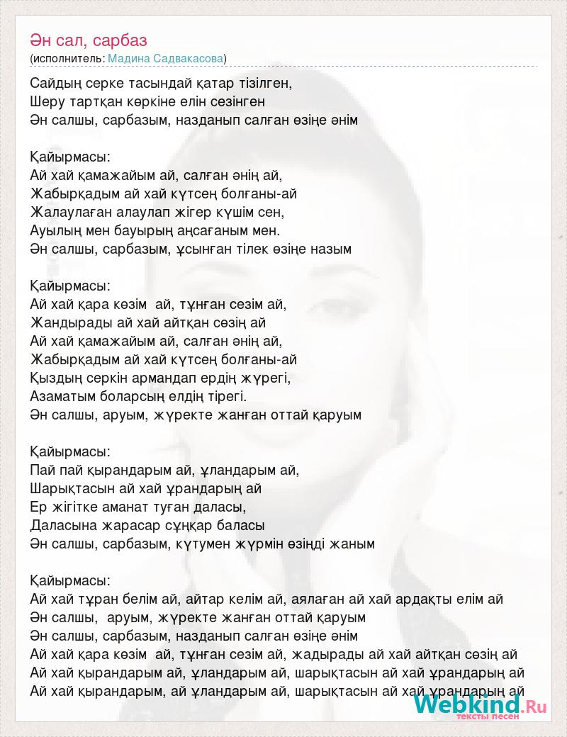 Сайдың серке тасындай қатар тізілген, Шеру тартқан көркіне елін сезінген Ән салшы, сарбазым, назданып салған өзіңе әнім Қайырмасы: Ай хай қамажайым ай, салған әнің ай, Жабырқадым ай хай күтсең болғаны-ай Жалаулаған алаулап жігер күшім сен, Ауылың мен бауырың аңсағаным мен. Ән салшы, сарбазым, ұсынған тілек өзіңе назым Қайырмасы: Ай хай қара көзім ай, тұнған сезім ай, Жандырады ай хай айтқан сөзің ай Ай хай қамажайым ай, салған әнің ай, Жабырқадым ай хай күтсең болғаны-ай Қыздың серкін армандап ердің жүрегі, Азаматым боларсың елдің тірегі. Ән салшы, аруым, жүректе жанған оттай қаруым Қайырмасы: Пай пай қырандарым ай, ұландарым ай, Шарықтасын ай хай ұрандарың ай Ер жігітке аманат туған даласы, Даласына жарасар сұңқар баласы Ән салшы, сарбазым, күтумен жүрмін өзіңді жаным Қайырмасы: Ай хай тұран белім ай, айтар келім ай, аялаған ай хай ардақты елім ай Ән салшы, аруым, жүректе жанған оттай қаруым Ән салшы, сарбазым, назданып салған өзіңе әнім Ай хай қара көзім ай, тұнған сезім ай, жадырады ай хай айтқан сөзің ай Ай хай қырандарым ай, ұландарым ай, шарықтасын ай хай ұрандарың ай Ай хай қырандарым, ай ұландарым ай, шарықтасын ай хай ұрандарың ай
