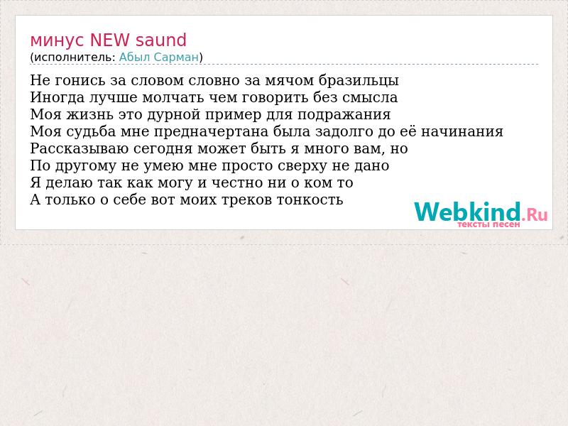 Не гонись за словом словно за мячом бразильцы Иногда лучше молчать чем говорить без смысла Моя жизнь это дурной пример для подражания Моя судьба мне предначертана была задолго до её начинания Рассказываю сегодня может быть я много вам, но По другому не умею мне просто сверху не дано Я делаю так как могу и честно ни о ком то А только о себе вот моих треков тонкость