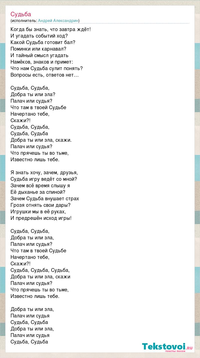 Когда бы знать, что завтра ждёт! И угадать событий ход? Какой Судьба готовит бал? Поминки или карнавал? И тайный смысл угадать Намёков, знаков и примет: Что нам Судьба сулит понять? Вопросы есть, ответов нет… Судьба, Судьба, Добра ты или зла? Палач или судья? Что там в твоей Судьбе Начертано тебе, Скажи?! Судьба, Судьба, Судьба, Судьба Добра ты или зла, скажи. Палач или судья? Что прячешь ты во тьме, Известно лишь тебе. Я знать хочу, зачем, друзья, Судьба игру ведёт со мной? Зачем всё время слышу я Её дыханье за спиной? Зачем Судьба внушает страх Грозя отнять свои дары? Игрушки мы в её руках, И предрешён исход игры! Судьба, Судьба, Добра ты или зла, Палач или судья? Что там в твоей Судьбе Начертано тебе, Скажи?! Судьба, Судьба, Судьба, Добра ты или зла, скажи Палач или судья? Что прячешь ты во тьме, Известно лишь тебе. Добра ты или зла, Палач или судья Судьба, Судьба Добра ты или зла, Палач или судья Судьба, Судьба