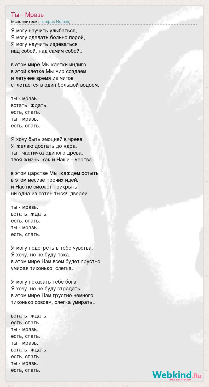 Я могу научить улыбаться, Я могу сделать больно порой, Я могу научить издеваться над собой, над самим собой.. в этом мире Мы клетки индиго, в этой клетке Мы мир создаем, и летучее время из мигов сплетается в один большой водоем. ты - мразь. встать, ждать. есть, спать. ты - мразь. есть, спать. Я хочу быть эмоцией в чреве, Я желаю достать до ядра. ты - частичка единого древа, твоя жизнь, как и Наши - мертва. в этом царстве Мы жаждем остыть в этом месиве прочих идей. и Нас не сможет прикрыть ни одна из сотен тысяч дверей.. ты - мразь. встать, ждать. есть, спать. ты - мразь. есть, спать. Я могу подогреть в тебе чувства, Я хочу, но не буду пока. в этом мире Нам всем будет грустно, умирая тихонько, слегка.. Я могу показать тебе бога, Я хочу, но не буду страдать. в этом мире Нам грустно немного, тихонько совсем, слегка умирать.. встать, ждать. есть, спать. ты - мразь. есть, спать. ты - мразь. встать, ждать. есть, спать. ты - мразь. есть, спать.