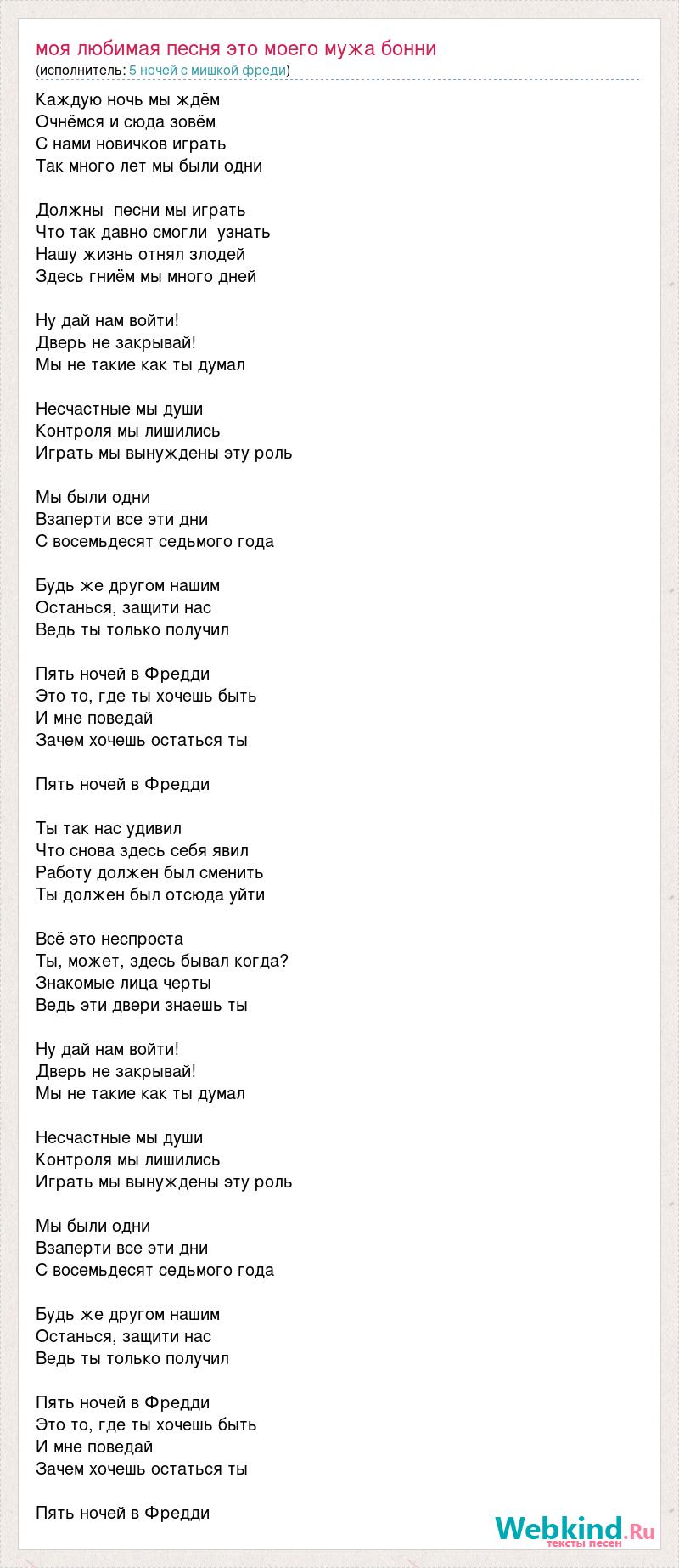 Каждую ночь мы ждём Очнёмся и сюда зовём С нами новичков играть Так много лет мы были одни Должны песни мы играть Что так давно смогли узнать Нашу жизнь отнял злодей Здесь гниём мы много дней Ну дай нам войти! Дверь не закрывай! Мы не такие как ты думал Несчастные мы души Контроля мы лишились Играть мы вынуждены эту роль Мы были одни Взаперти все эти дни С восемьдесят седьмого года Будь же другом нашим Останься, защити нас Ведь ты только получил Пять ночей в Фредди Это то, где ты хочешь быть И мне поведай Зачем хочешь остаться ты Пять ночей в Фредди Ты так нас удивил Что снова здесь себя явил Работу должен был сменить Ты должен был отсюда уйти Всё это неспроста Ты, может, здесь бывал когда? Знакомые лица черты Ведь эти двери знаешь ты Ну дай нам войти! Дверь не закрывай! Мы не такие как ты думал Несчастные мы души Контроля мы лишились Играть мы вынуждены эту роль Мы были одни Взаперти все эти дни С восемьдесят седьмого года Будь же другом нашим Останься, защити нас Ведь ты только получил Пять ночей в Фредди Это то, где ты хочешь быть И мне поведай Зачем хочешь остаться ты Пять ночей в Фредди