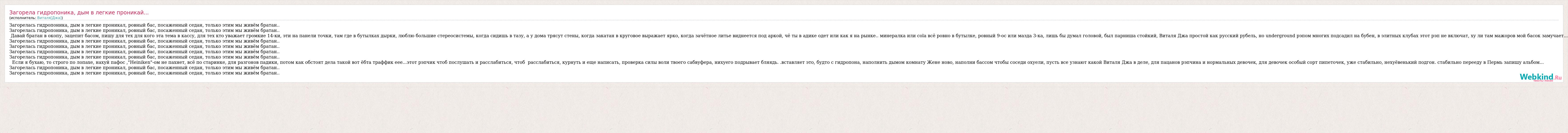 Загорелась гидропоника, дым в легкие проникал, ровный бас, посаженный седан, только этим мы живём братан.. Загорелась гидропоника, дым в легкие проникал, ровный бас, посаженный седан, только этим мы живём братан.. Давай братан в окопу, зацепит басом, пишу для тех для кого эта тема в кассу, для тех кто уважает громкие 14-ки, эти на панели точки, там где в бутылках дырки, люблю большие стереосистемы, когда сидишь в тазу, а у дома трясут стены, когда закатан в круговое выражает ярко, когда зачётное литье виднеется под аркой, чё ты в адике одет или как я на рынке.. минералка или cola всё ровно в бутылке, ровный 9-ос или мазда 3-ка, лишь бы думал головой, был парниша стойкий, Виталя Джа простой как русский рубель, но underground рэпом многих подсадил на бубен, в элитных клубах этот рэп не включат, ху ли там мажоров мой басок замучает... Загорелась гидропоника, дым в легкие проникал, ровный бас, посаженный седан, только этим мы живём братан.. Загорелась гидропоника, дым в легкие проникал, ровный бас, посаженный седан, только этим мы живём братан.. Загорелась гидропоника, дым в легкие проникал, ровный бас, посаженный седан, только этим мы живём братан.. Загорелась гидропоника, дым в легкие проникал, ровный бас, посаженный седан, только этим мы живём братан.. Если я бухаю, то строго по лопахе, нахуй пафос ,"Heiniken"-ом не пахнет, всё по старинке, для разгонов падики, потом как обстоят дела такой вот ёбта траффик еее...этот рэпчик чтоб послушать и расслабиться, чтоб расслабиться, курнуть и еще написать, проверка силы воли твоего сабвуфера, нихуего подрывает бляядь. .вставляет это, будто с гидропона, наполнить дымом комнату Жене ново, наполни бассом чтобы соседи охуели, пусть все узнают какой Виталя Джа в деле, для пацанов рэпчина и нормальных девочек, для девочек особый сорт пипеточек, уже стабильно, нехуёвенький подгон. стабильно перееду в Пермь запишу альбом... Загорелась гидропоника, дым в легкие проникал, ровный бас, посаженный седан, только этим мы живём братан.. Загорелась гидропоника, дым в легкие проникал, ровный бас, посаженный седан, только этим мы живём братан..