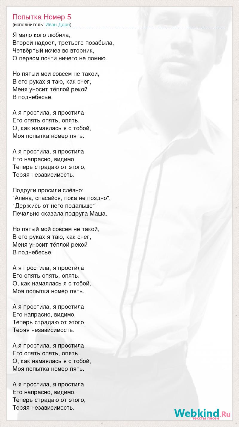 Я мало кого любила, Второй надоел, третьего позабыла, Четвёртый исчез во вторник, О первом почти ничего не помню. Но пятый мой совсем не такой, В его руках я таю, как снег, Меня уносит тёплой рекой В поднебесье. А я простила, я простила Его опять опять, опять. О, как намаялась я с тобой, Моя попытка номер пять. А я простила, я простила Его напрасно, видимо. Теперь страдаю от этого, Теряя независимость. Подруги просили слёзно: "Алёна, спасайся, пока не поздно". "Держись от него подальше" - Печально сказала подруга Маша. Но пятый мой совсем не такой, В его руках я таю, как снег, Меня уносит тёплой рекой В поднебесье. А я простила, я простила Его опять опять, опять. О, как намаялась я с тобой, Моя попытка номер пять. А я простила, я простила Его напрасно, видимо. Теперь страдаю от этого, Теряя независимость. А я простила, я простила Его опять опять, опять. О, как намаялась я с тобой, Моя попытка номер пять. А я простила, я простила Его напрасно, видимо. Теперь страдаю от этого, Теряя независимость.