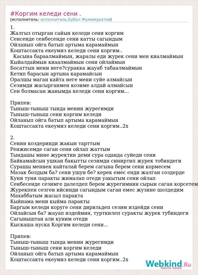 1. Жалгыз отырган сайын келеди сени коргим Сенсенде сенбесенде сени катты сагындым Ойланып ойга батып артыма карамаймын Коштассакта екеумиз келеди сени коргим.. Касына бараалмаймын, жаралы еди журек сени мен киалмаймын Кыйалдаймын киаалмаймын сени ойлаймын Босаттын мени неге?суракка жауаб табаалмаймын Кетип барасын артына карамайсын Оралшы маган кайта неге мени суйе алмайсын Сезимди жасырганмен козиме алдай алмайсын Сен болмасан жанымда келеди сени коргим... Припев: Тыныш-тыныш тында менин журегимди Тыныш-тыныш сени коргим келеди Ойланып ойга батып артыма карамаймын Коштассакта екеумиз келеди сени коргим..2х 2. Сенин коздеринди жакын тарттым Ренжисемде саган сени ойлап жаттым Тындашы мине журектин деми сура оданда суйеди сени Байкамайсын ушкан бакытты сезимди синиртип журек тобиндеги Сурашы меннен кайталай берем сагына берем сени кормесем Мазак болдым ба? сени ушун бе? керек емес енди жалган создерде Куни туни паракты жималап отеди уакытым сени ойлап Сенбесенде сезимге далелдеп берем журегимнин сырын саган корсетем Журекпен сезген ийсинди сагындым саган емес жузине шолдедим Махаббатым жасыл паракта Кыйнама мени кыйма паракты Баргым келеди коруге сени дирильдеп сезим издейди сени Ойлайсын ба? жауап издеймин, турткилеп суракты журек тубиндеги Сагыныштан али куним отеди Кыскаша нуска Коргим келеди сени... Припев: Тыныш-тыныш тында менин журегимди Тыныш-тыныш сени коргим келеди Ойланып ойга батып артыма карамаймын Коштассакта екеумиз келеди сени коргим..2х