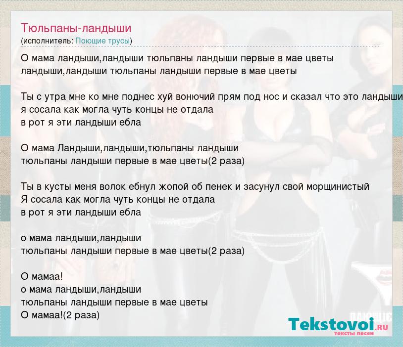 О мама ландыши,ландыши тюльпаны ландыши первые в мае цветы ландыши,ландыши тюльпаны ландыши первые в мае цветы Ты с утра мне ко мне поднес хуй вонючий прям под нос и сказал что это ландыши я сосала как могла чуть концы не отдала в рот я эти ландыши ебла О мама Ландыши,ландыши,тюльпаны ландыши тюльпаны ландыши первые в мае цветы(2 раза) Ты в кусты меня волок ебнул жопой об пенек и засунул свой морщинистый Я сосала как могла чуть концы не отдала в рот я эти ландыши ебла о мама ландыши,ландыши тюльпаны ландыши первые в мае цветы(2 раза) О мамаа! о мама ландыши,ландыши тюльпаны ландыши первые в мае цветы О мамаа!(2 раза)