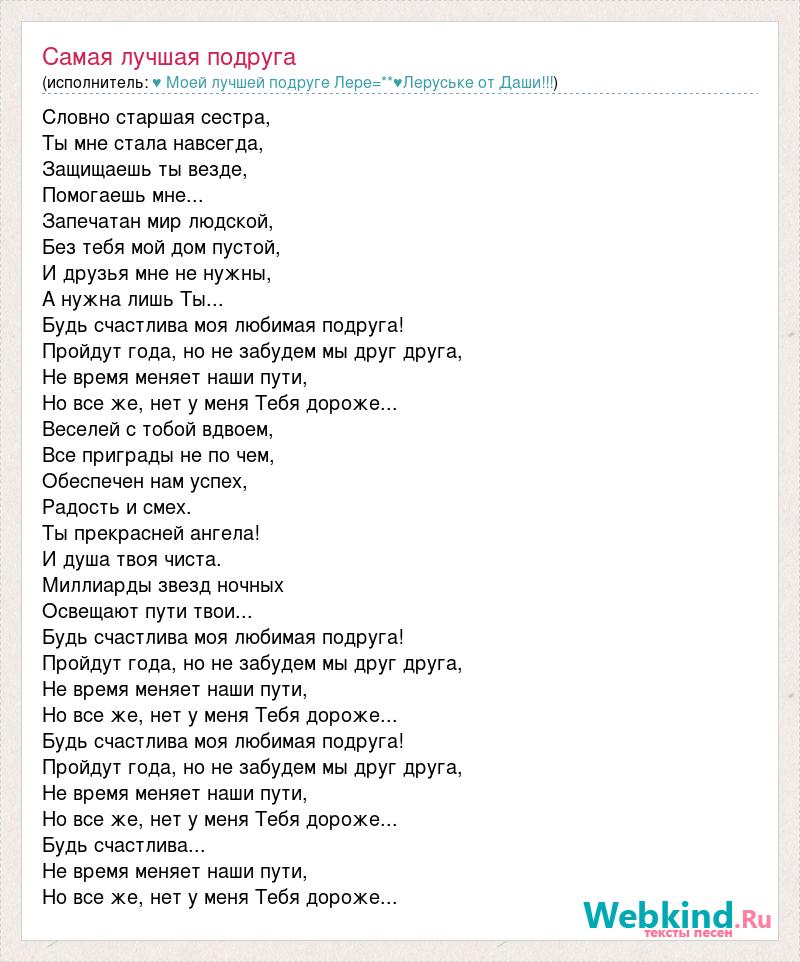 Словно старшая сестра, Ты мне стала навсегда, Защищаешь ты везде, Помогаешь мне... Запечатан мир людской, Без тебя мой дом пустой, И друзья мне не нужны, А нужна лишь Ты... Будь счастлива моя любимая подруга! Пройдут года, но не забудем мы друг друга, Не время меняет наши пути, Но все же, нет у меня Тебя дороже... Веселей с тобой вдвоем, Все приграды не по чем, Обеспечен нам успех, Радость и смех. Ты прекрасней ангела! И душа твоя чиста. Миллиарды звезд ночных Освещают пути твои... Будь счастлива моя любимая подруга! Пройдут года, но не забудем мы друг друга, Не время меняет наши пути, Но все же, нет у меня Тебя дороже... Будь счастлива моя любимая подруга! Пройдут года, но не забудем мы друг друга, Не время меняет наши пути, Но все же, нет у меня Тебя дороже... Будь счастлива... Не время меняет наши пути, Но все же, нет у меня Тебя дороже...