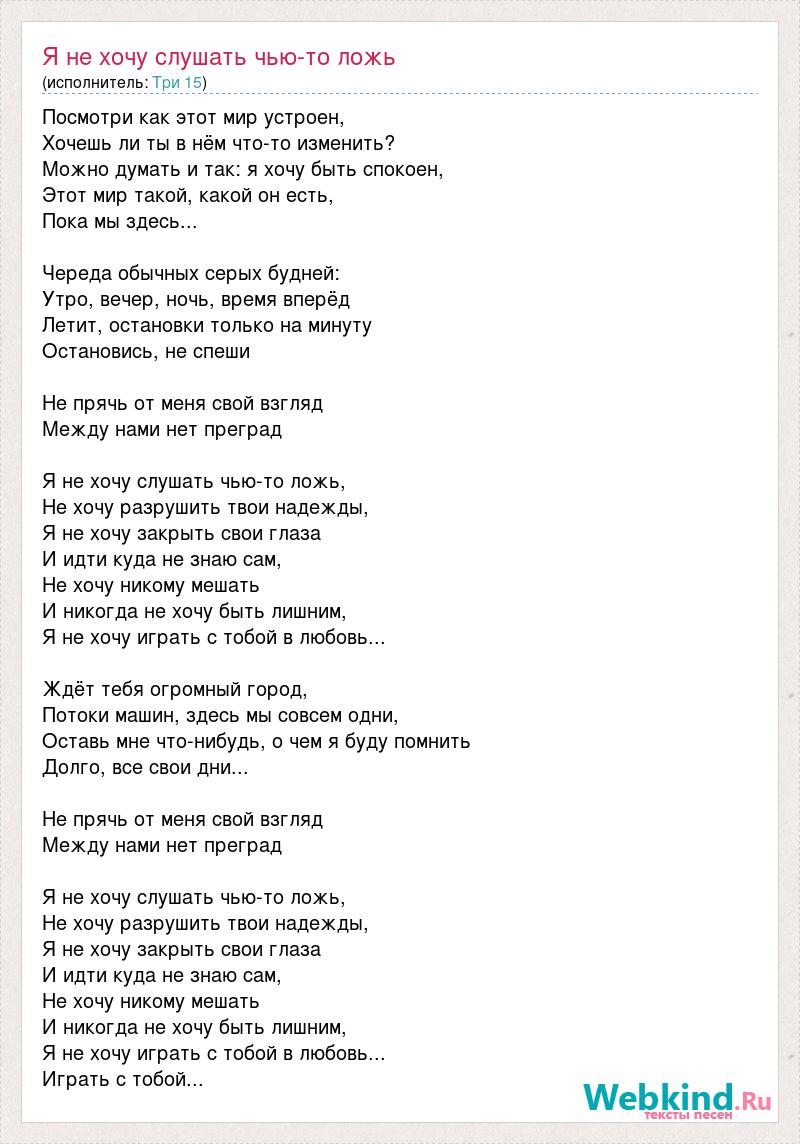 Посмотри как этот мир устроен, Хочешь ли ты в нём что-то изменить? Можно думать и так: я хочу быть спокоен, Этот мир такой, какой он есть, Пока мы здесь... Череда обычных серых будней: Утро, вечер, ночь, время вперёд Летит, остановки только на минуту Остановись, не спеши Не прячь от меня свой взгляд Между нами нет преград Я не хочу слушать чью-то ложь, Не хочу разрушить твои надежды, Я не хочу закрыть свои глаза И идти куда не знаю сам, Не хочу никому мешать И никогда не хочу быть лишним, Я не хочу играть с тобой в любовь... Ждёт тебя огромный город, Потоки машин, здесь мы совсем одни, Оставь мне что-нибудь, о чем я буду помнить Долго, все свои дни... Не прячь от меня свой взгляд Между нами нет преград Я не хочу слушать чью-то ложь, Не хочу разрушить твои надежды, Я не хочу закрыть свои глаза И идти куда не знаю сам, Не хочу никому мешать И никогда не хочу быть лишним, Я не хочу играть с тобой в любовь... Играть с тобой...