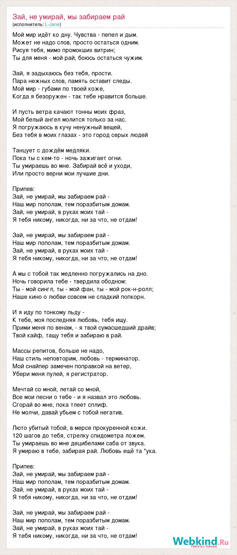 Мой мир идёт ко дну. Чувства - пепел и дым. Может не надо слов, просто остаться одним. Рисуя тебя, мимо промокших витрин; Ты для меня - мой рай, боюсь остаться чужим. Зай, я задыхаюсь без тебя, прости. Пара нежных слов, память оставит следы. Мой мир - губами по твоей коже, Когда я безоружен - так тебе нравится больше. И пусть ветра качают тонны моих фраз, Мой белый ангел молится только за нас. Я погружаюсь в кучу ненужный вещей, Без тебя в моих глазах - это город серых людей Танцует с дождём медляки. Пока ты с кем-то - ночь зажигает огни. Ты умираешь во мне. Забирай всё и уходи, Или просто верни мои лучшие дни. Припев: Зай, не умирай, мы забираем рай - Наш мир пополам, тем поразбитым домам. Зай, не умирай, в руках моих тай - Я тебя никому, никогда, ни за что, не отдам! Зай, не умирай, мы забираем рай - Наш мир пополам, тем поразбитым домам. Зай, не умирай, в руках моих тай - Я тебя никому, никогда, ни за что, не отдам! А мы с тобой так медленно погружались на дно. Ночь говорила тебе - твердила ободном: Ты - мой сингл, ты - мой фан, ты - мой рок-н-ролл; Наше кино о любви совсем не сладкий попкорн. И я иду по тонкому льду - К тебе, моя последняя любовь, тебя ищу. Прими меня по венам, - я твой сумасшедший драйв; Твой кайф, тащу тебя и забираю в рай. Массы репитов, больше не надо, Наш стиль неповторим, любовь - терминатор. Мой снайпер замечен поправкой на ветер, Убери меня пулей, я регистратор. Мечтай со мной, летай со мной, Все мои песни о тебе - и я назвал это любовь. Сгорай во мне, пока тлеет сплиф. Не молчи, давай убьем с тобой негатив. Люто убитый тобой, в мерсе прокуренной кожи. 120 шагов до тебя, стрелку спидометра ложем. Ты умираешь во мне децибелами саба от звука. Я умираю в тебе, забирая рай. Любовь ещё та *ука. Припев: Зай, не умирай, мы забираем рай - Наш мир пополам, тем поразбитым домам. Зай, не умирай, в руках моих тай - Я тебя никому, никогда, ни за что, не отдам! Зай, не умирай, мы забираем рай - Наш мир пополам, тем поразбитым домам. Зай, не умирай, в руках моих тай - Я тебя никому, никогда, ни за что, не отдам!