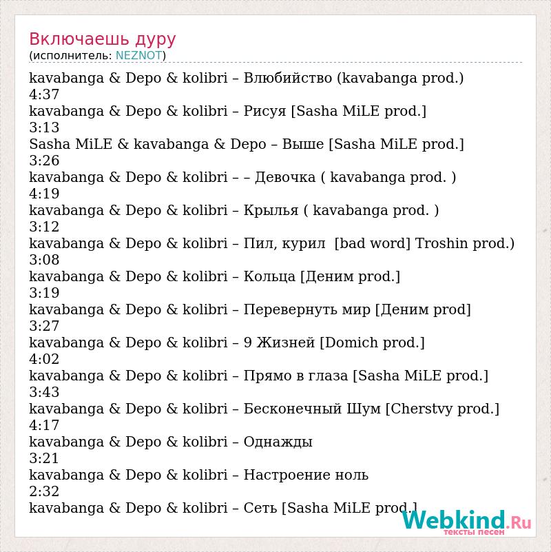kavabanga & Depo & kolibri – Влюбийство (kavabanga prod.) 4:37 kavabanga & Depo & kolibri – Рисуя [Sasha MiLE prod.] 3:13 Sasha MiLE & kavabanga & Depo – Выше [Sasha MiLE prod.] 3:26 kavabanga & Depo & kolibri – – Девочка ( kavabanga prod. ) 4:19 kavabanga & Depo & kolibri – Крылья ( kavabanga prod. ) 3:12 kavabanga & Depo & kolibri – Пил, курил [bad word] Troshin prod.) 3:08 kavabanga & Depo & kolibri – Кольца [Деним prod.] 3:19 kavabanga & Depo & kolibri – Перевернуть мир [Деним prod] 3:27 kavabanga & Depo & kolibri – 9 Жизней [Domich prod.] 4:02 kavabanga & Depo & kolibri – Прямо в глаза [Sasha MiLE prod.] 3:43 kavabanga & Depo & kolibri – Бесконечный Шум [Cherstvy prod.] 4:17 kavabanga & Depo & kolibri – Однажды 3:21 kavabanga & Depo & kolibri – Настроение ноль 2:32 kavabanga & Depo & kolibri – Сеть [Sasha MiLE prod.]