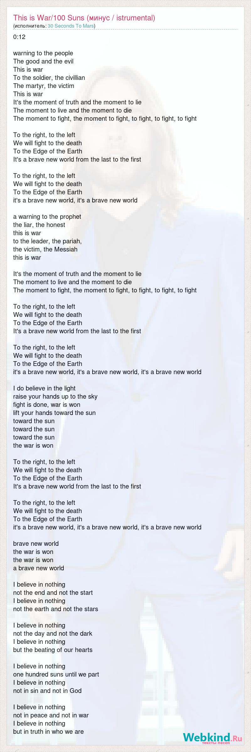 0:12 warning to the people The good and the evil This is war To the soldier, the civillian The martyr, the victim This is war It's the moment of truth and the moment to lie The moment to live and the moment to die The moment to fight, the moment to fight, to fight, to fight, to fight To the right, to the left We will fight to the death To the Edge of the Earth It's a brave new world from the last to the first To the right, to the left We will fight to the death To the Edge of the Earth it's a brave new world, it's a brave new world a warning to the prophet the liar, the honest this is war to the leader, the pariah, the victim, the Messiah this is war It's the moment of truth and the moment to lie The moment to live and the moment to die The moment to fight, the moment to fight, to fight, to fight, to fight To the right, to the left We will fight to the death To the Edge of the Earth It's a brave new world from the last to the first To the right, to the left We will fight to the death To the Edge of the Earth it's a brave new world, it's a brave new world, it's a brave new world I do believe in the light raise your hands up to the sky fight is done, war is won lift your hands toward the sun toward the sun toward the sun toward the sun the war is won To the right, to the left We will fight to the death To the Edge of the Earth It's a brave new world from the last to the first To the right, to the left We will fight to the death To the Edge of the Earth it's a brave new world, it's a brave new world, it's a brave new world brave new world the war is won the war is won a brave new world I believe in nothing not the end and not the start I believe in nothing not the earth and not the stars I believe in nothing not the day and not the dark I believe in nothing but the beating of our hearts I believe in nothing one hundred suns until we part I believe in nothing not in sin and not in God I believe in nothing not in peace and not in war I believe in nothing but in truth in who we are