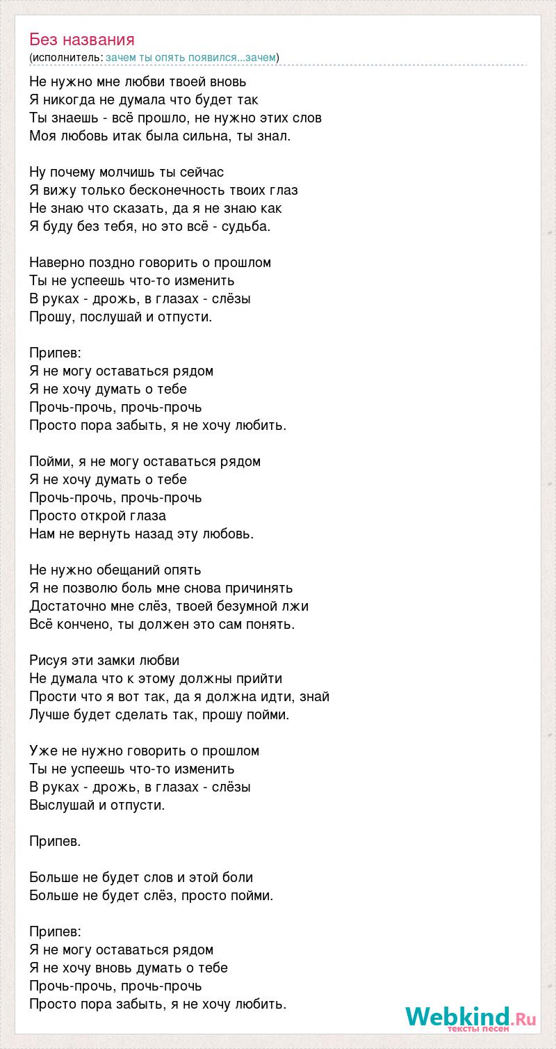 Не нужно мне любви твоей вновь Я никогда не думала что будет так Ты знаешь - всё прошло, не нужно этих слов Моя любовь итак была сильна, ты знал. Ну почему молчишь ты сейчас Я вижу только бесконечность твоих глаз Не знаю что сказать, да я не знаю как Я буду без тебя, но это всё - судьба. Наверно поздно говорить о прошлом Ты не успеешь что-то изменить В руках - дрожь, в глазах - слёзы Прошу, послушай и отпусти. Припев: Я не могу оставаться рядом Я не хочу думать о тебе Прочь-прочь, прочь-прочь Просто пора забыть, я не хочу любить. Пойми, я не могу оставаться рядом Я не хочу думать о тебе Прочь-прочь, прочь-прочь Просто открой глаза Нам не вернуть назад эту любовь. Не нужно обещаний опять Я не позволю боль мне снова причинять Достаточно мне слёз, твоей безумной лжи Всё кончено, ты должен это сам понять. Рисуя эти замки любви Не думала что к этому должны прийти Прости что я вот так, да я должна идти, знай Лучше будет сделать так, прошу пойми. Уже не нужно говорить о прошлом Ты не успеешь что-то изменить В руках - дрожь, в глазах - слёзы Выслушай и отпусти. Припев. Больше не будет слов и этой боли Больше не будет слёз, просто пойми. Припев: Я не могу оставаться рядом Я не хочу вновь думать о тебе Прочь-прочь, прочь-прочь Просто пора забыть, я не хочу любить.