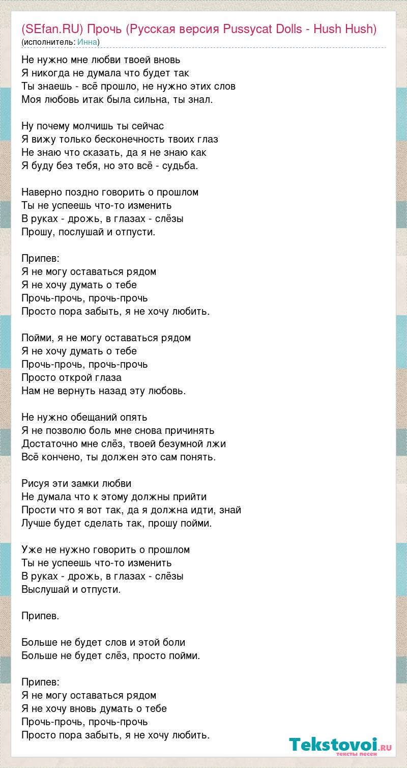 Не нужно мне любви твоей вновь Я никогда не думала что будет так Ты знаешь - всё прошло, не нужно этих слов Моя любовь итак была сильна, ты знал. Ну почему молчишь ты сейчас Я вижу только бесконечность твоих глаз Не знаю что сказать, да я не знаю как Я буду без тебя, но это всё - судьба. Наверно поздно говорить о прошлом Ты не успеешь что-то изменить В руках - дрожь, в глазах - слёзы Прошу, послушай и отпусти. Припев: Я не могу оставаться рядом Я не хочу думать о тебе Прочь-прочь, прочь-прочь Просто пора забыть, я не хочу любить. Пойми, я не могу оставаться рядом Я не хочу думать о тебе Прочь-прочь, прочь-прочь Просто открой глаза Нам не вернуть назад эту любовь. Не нужно обещаний опять Я не позволю боль мне снова причинять Достаточно мне слёз, твоей безумной лжи Всё кончено, ты должен это сам понять. Рисуя эти замки любви Не думала что к этому должны прийти Прости что я вот так, да я должна идти, знай Лучше будет сделать так, прошу пойми. Уже не нужно говорить о прошлом Ты не успеешь что-то изменить В руках - дрожь, в глазах - слёзы Выслушай и отпусти. Припев. Больше не будет слов и этой боли Больше не будет слёз, просто пойми. Припев: Я не могу оставаться рядом Я не хочу вновь думать о тебе Прочь-прочь, прочь-прочь Просто пора забыть, я не хочу любить.