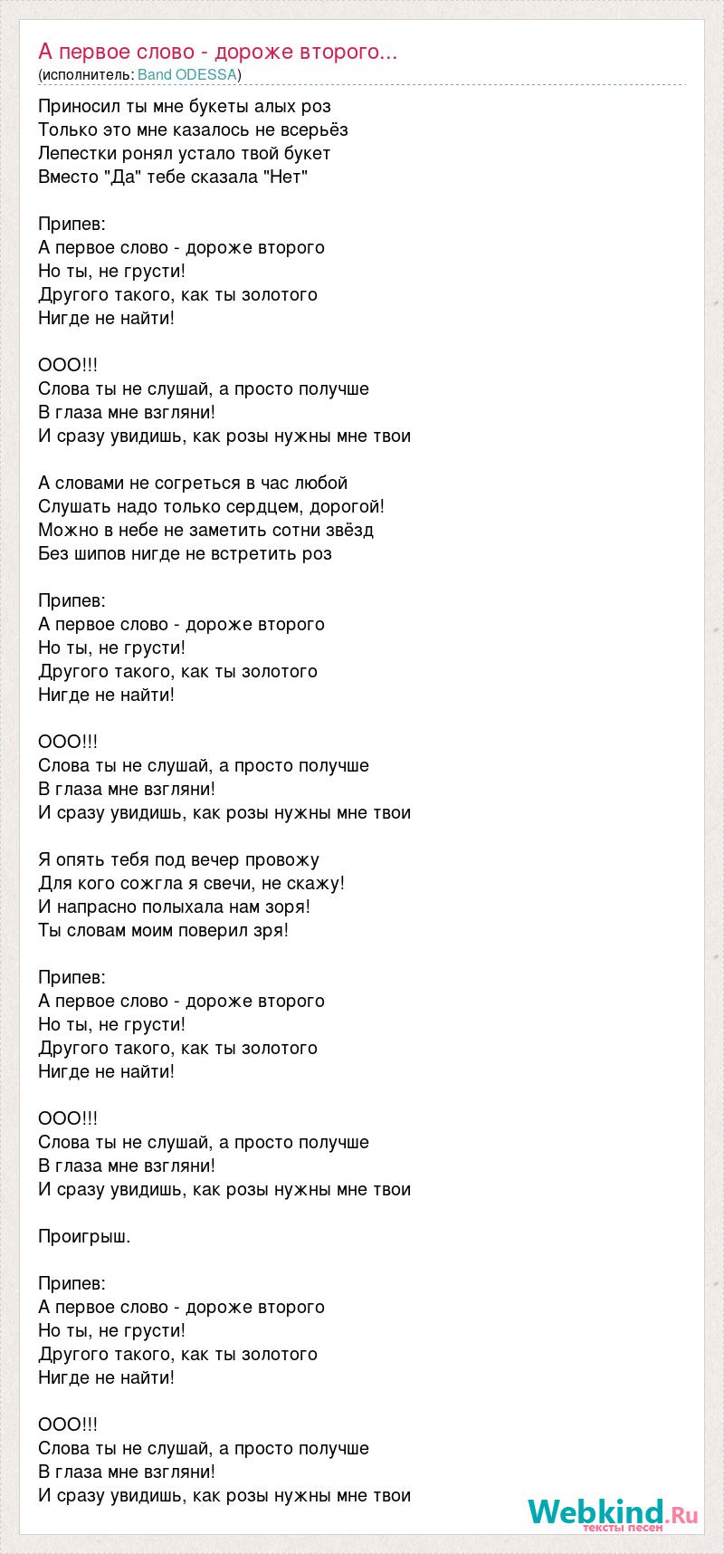 Приносил ты мне букеты алых роз Только это мне казалось не всерьёз Лепестки ронял устало твой букет Вместо "Да" тебе сказала "Нет" Припев: А первое слово - дороже второго Но ты, не грусти! Другого такого, как ты золотого Нигде не найти! ООО!!! Слова ты не слушай, а просто получше В глаза мне взгляни! И сразу увидишь, как розы нужны мне твои А словами не согреться в час любой Слушать надо только сердцем, дорогой! Можно в небе не заметить сотни звёзд Без шипов нигде не встретить роз Припев: А первое слово - дороже второго Но ты, не грусти! Другого такого, как ты золотого Нигде не найти! ООО!!! Слова ты не слушай, а просто получше В глаза мне взгляни! И сразу увидишь, как розы нужны мне твои Я опять тебя под вечер провожу Для кого сожгла я свечи, не скажу! И напрасно полыхала нам зоря! Ты словам моим поверил зря! Припев: А первое слово - дороже второго Но ты, не грусти! Другого такого, как ты золотого Нигде не найти! ООО!!! Слова ты не слушай, а просто получше В глаза мне взгляни! И сразу увидишь, как розы нужны мне твои Проигрыш. Припев: А первое слово - дороже второго Но ты, не грусти! Другого такого, как ты золотого Нигде не найти! ООО!!! Слова ты не слушай, а просто получше В глаза мне взгляни! И сразу увидишь, как розы нужны мне твои