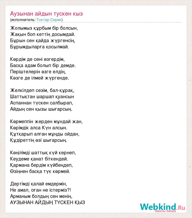Жолымыз құрбым бір болсын, Жақын боп кеттің досымдай. Бұрын сен қайда жүргенсің, Бұрымдыларға қосылмай. Көрдім де сені өзгердім, Басқа адам болып бір демде. Періштелерін өзге елдің, Көзге де ілмей жүргенде. Желкілдеп сезім, бал-құрақ, Шаттықтан шаршап қуансын Аспаннан түскен салбырап, Айдың сен қызы шығарсың. Көрмеппін жерден мұндай жан, Көрімдік алса Күн алсын. Құтқарып алған мұңды ойдан, Құдіреттің өзі шығарсың. Көңілімді шаттық күй кернеп, Кеудеме қанат біткендей. Қармана бердім күйбеңдеп, Өзіңнен басқа түк көрмей. Дертімді қалай емдермін, Не амал, оған не істерміз?! Арманым болдың сен менің, АУЗЫНАН АЙДЫҢ ТҮСКЕН ҚЫЗ