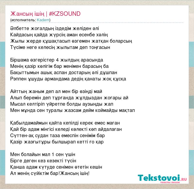 Әлбетте жоғалдың іздедім желіден әлі Кайдасың қайда жүрсің аман есенбе хәлің Жылы жерде құшақтасып өзгемен жатқан боларсың Түсіме неге келесің жылытам деп тоңғасын Біршама өзгерістер 4 жылдың арасында Менің қазір көлігім бар менімен барасың ба Бақыттымын ашық аспан достарың әлі дұшпан Рэппен ұшуды армандама дедің қанаты жоқ құсқа Айттың жаным деп ал мен бір өзіңді май Алып беремін деп тұрғанда жұлдыздан жоғары ай Мысал келтіріп үйретпе болды аузыңды жап Мен мұнда сен туралы жазсам дейм коймайды мақтап Қабылдамаймын қайта кепілді керек емес маған Қай бір адам мінгісі келеді көлекті көп айдалаған Сүттен-ақ судан таза емеспін сенімім бар Қазір жазғытұры былшырап кетті ғо қар Мен болайын мал 1 сен үшін Бірге деген кез кезекті түсін Қанша адам күтуде сенімен өтетін кешін Ал менің сүйіктім бар!Жансың ішің!