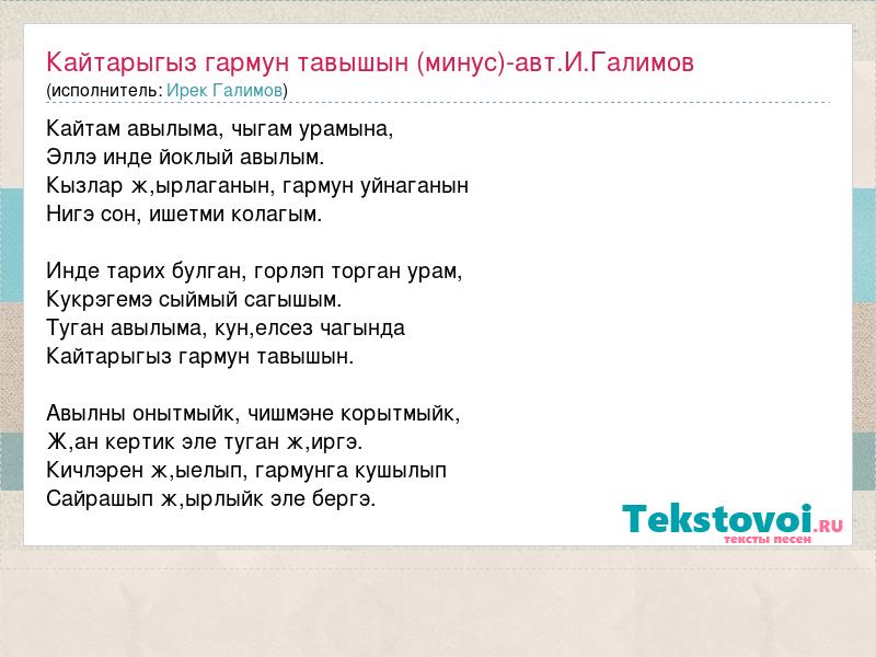 Кайтам авылыма, чыгам урамына, Эллэ инде йоклый авылым. Кызлар ж,ырлаганын, гармун уйнаганын Нигэ сон, ишетми колагым. Инде тарих булган, горлэп торган урам, Кукрэгемэ сыймый сагышым. Туган авылыма, кун,елсез чагында Кайтарыгыз гармун тавышын. Авылны онытмыйк, чишмэне корытмыйк, Ж,ан кертик эле туган ж,иргэ. Кичлэрен ж,ыелып, гармунга кушылып Сайрашып ж,ырлыйк эле бергэ.