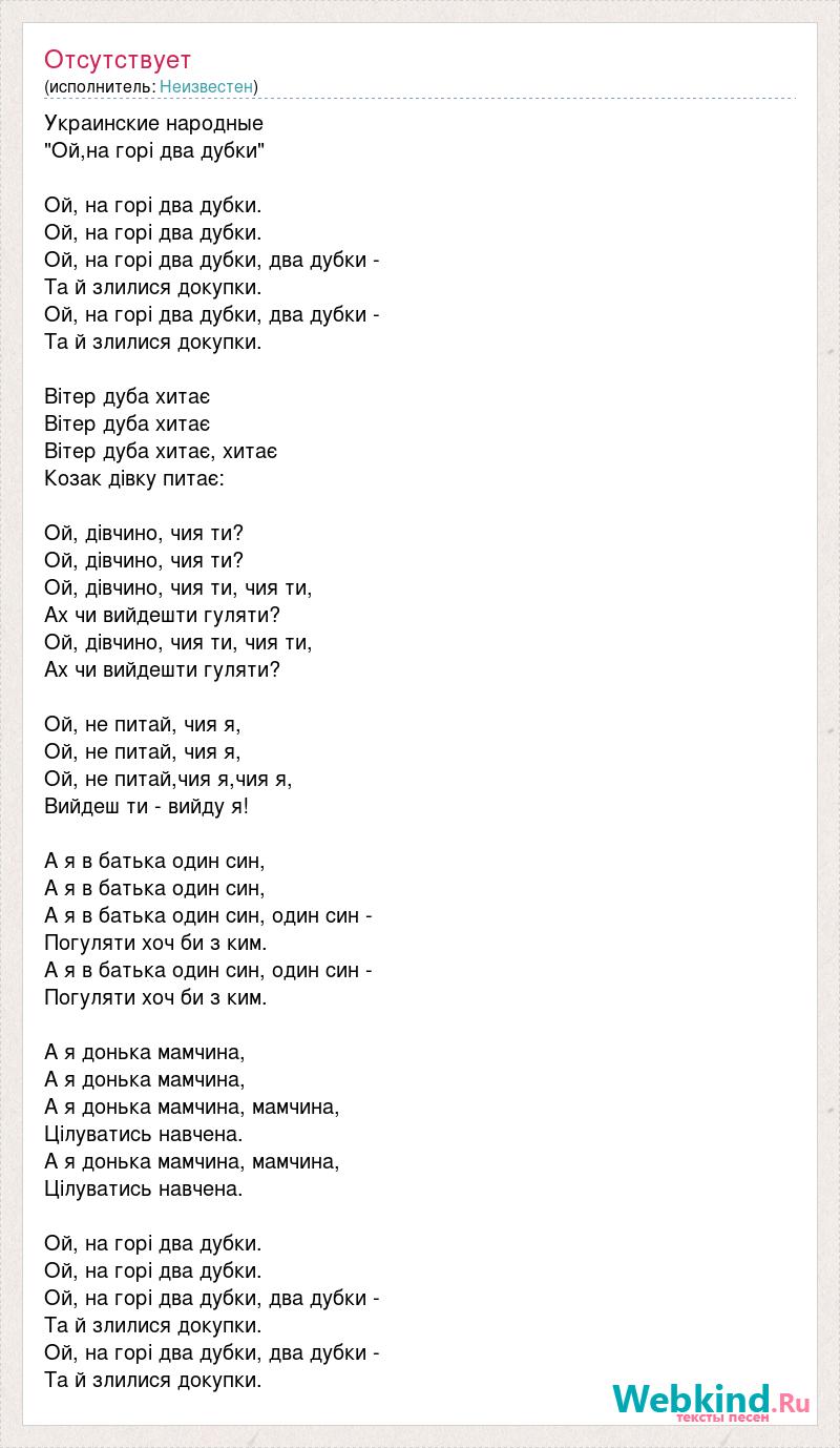 Украинские народные "Ой,на горі два дубки" Ой, на горі два дубки. Ой, на горі два дубки. Ой, на горі два дубки, два дубки - Та й злилися докупки. Ой, на горі два дубки, два дубки - Та й злилися докупки. Вітер дуба хитає Вітер дуба хитає Вітер дуба хитає, хитає Козак дівку питає: Ой, дівчино, чия ти? Ой, дівчино, чия ти? Ой, дівчино, чия ти, чия ти, Ах чи вийдешти гуляти? Ой, дівчино, чия ти, чия ти, Ах чи вийдешти гуляти? Ой, не питай, чия я, Ой, не питай, чия я, Ой, не питай,чия я,чия я, Вийдеш ти - вийду я! А я в батька один син, А я в батька один син, А я в батька один син, один син - Погуляти хоч би з ким. А я в батька один син, один син - Погуляти хоч би з ким. А я донька мамчина, А я донька мамчина, А я донька мамчина, мамчина, Цілуватись навчена. А я донька мамчина, мамчина, Цілуватись навчена. Ой, на горі два дубки. Ой, на горі два дубки. Ой, на горі два дубки, два дубки - Та й злилися докупки. Ой, на горі два дубки, два дубки - Та й злилися докупки.