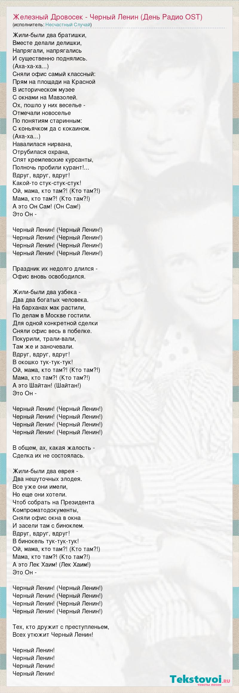 Жили-были два братишки, Вместе делали делишки, Напрягали, напрягались И существенно поднялись. (Аха-ха-ха...) Сняли офис самый классный: Прям на площади на Красной В историческом музее С окнами на Мавзолей. Ох, пошло у них веселье - Отмечали новоселье По понятиям старинным: С коньячком да с кокаином. (Аха-ха...) Навалилася нирвана, Отрубилася охрана, Спят кремлевские курсанты, Полночь пробили курант!... Вдруг, вдруг, вдруг! Какой-то стук-стук-стук! Ой, мама, кто там?! (Кто там?!) Мама, кто там?! (Кто там?!) А это Он Сам! (Он Сам!) Это Он - Черный Ленин! (Черный Ленин!) Черный Ленин! (Черный Ленин!) Черный Ленин! (Черный Ленин!) Черный Ленин! (Черный Ленин!) Праздник их недолго длился - Офис вновь освободился. Жили-были два узбека - Два два богатых человека. На барханах мак растили, По делам в Москве гостили. Для одной конкретной сделки Сняли офис весь в побелке. Покурили, трали-вали, Там же и заночевали. Вдруг, вдруг, вдруг! В окошко тук-тук-тук! Ой, мама, кто там?! (Кто там?!) Мама, кто там?! (Кто там?!) А это Шайтан! (Шайтан!) Это Он - Черный Ленин! (Черный Ленин!) Черный Ленин! (Черный Ленин!) Черный Ленин! (Черный Ленин!) Черный Ленин! (Черный Ленин!) В общем, ах, какая жалость - Сделка их не состоялась. Жили-были два еврея - Два нешуточных злодея. Все уже они имели, Но еще они хотели. Чтоб собрать на Президента Компроматодокументы, Сняли офис окна в окна И засели там с биноклем. Вдруг, вдруг, вдруг! В бинокель тук-тук-тук! Ой, мама, кто там?! (Кто там?!) Мама, кто там?! (Кто там?!) А это Лек Хаим! (Лек Хаим!) Это Он - Черный Ленин! (Черный Ленин!) Черный Ленин! (Черный Ленин!) Черный Ленин! (Черный Ленин!) Черный Ленин! (Черный Ленин!) Тех, кто дружит с преступленьем, Всех утюжит Черный Ленин! Черный Ленин! Черный Ленин! Черный Ленин! Черный Ленин!